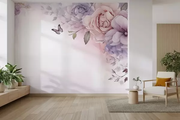 Fototapeedid Õrnad roosa ja lilla õied koos liblikaga Nr w04711