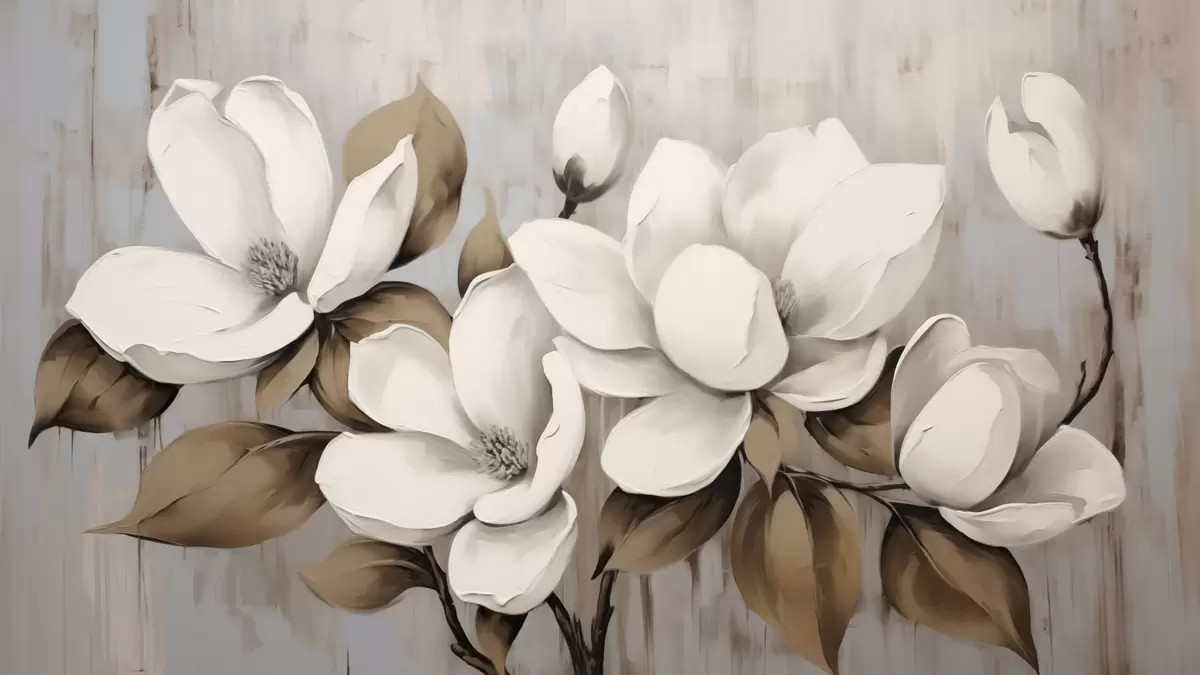 Fototapeedid Suured magnoliaõied hallikaspruunide lehtedega harjatud taustal Nr w04785