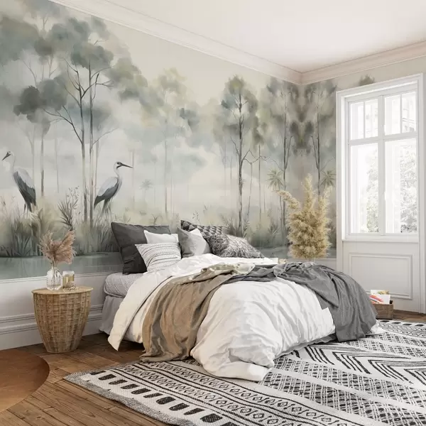 Fototapeedid Uduvõrk mets vee ääres koos kurgedega, pehme jahedad värvid Nr w04788