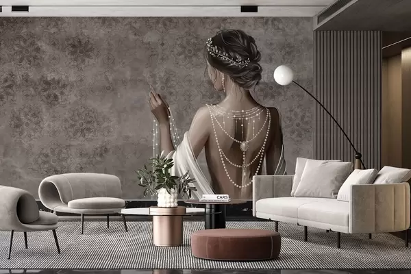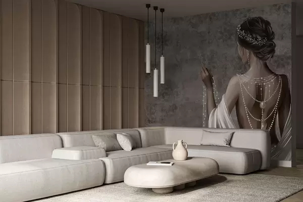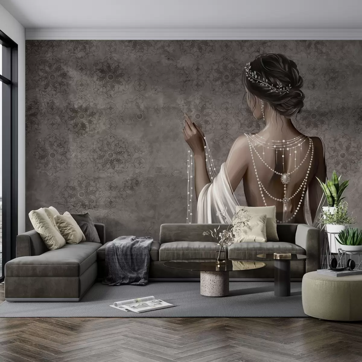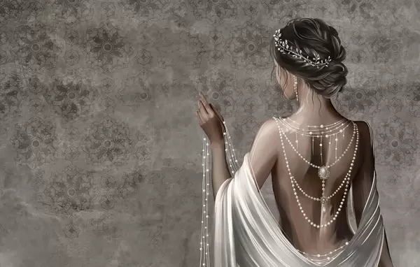 Fototapeedid Naine tagantvaates pärlitega, hall kivimustriline taust Nr w04854