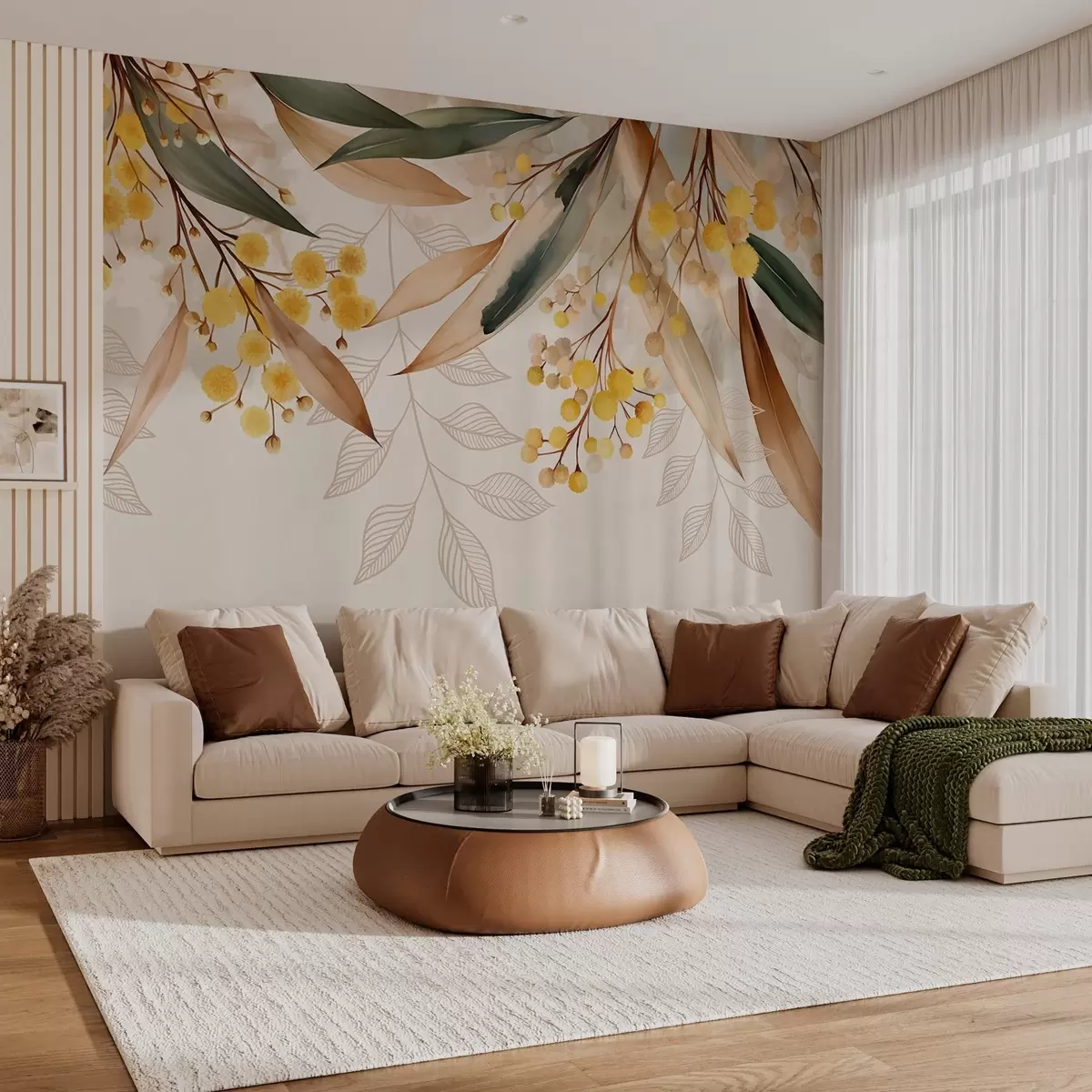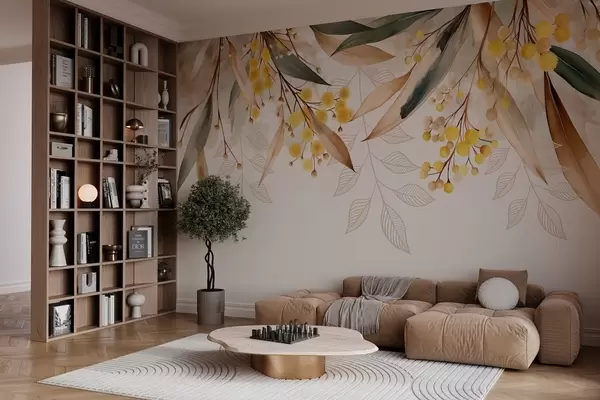 Fototapeedid akvarellistiilis ülalt langevad mimoosa õied ja lehed Nr w04880