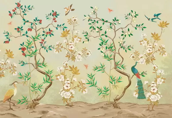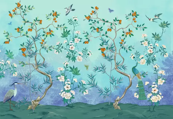 Fototapeedid Dekoratiivne stseen puude, lillede ja lindudega tumedal taustal Nr w05004