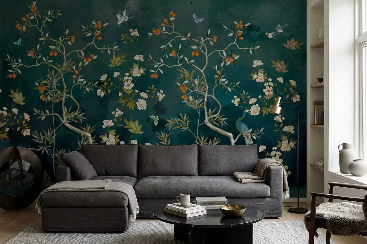 Fototapeedid Dekoratiivne stseen puude, lillede ja lindudega tumedal taustal Nr w05004
