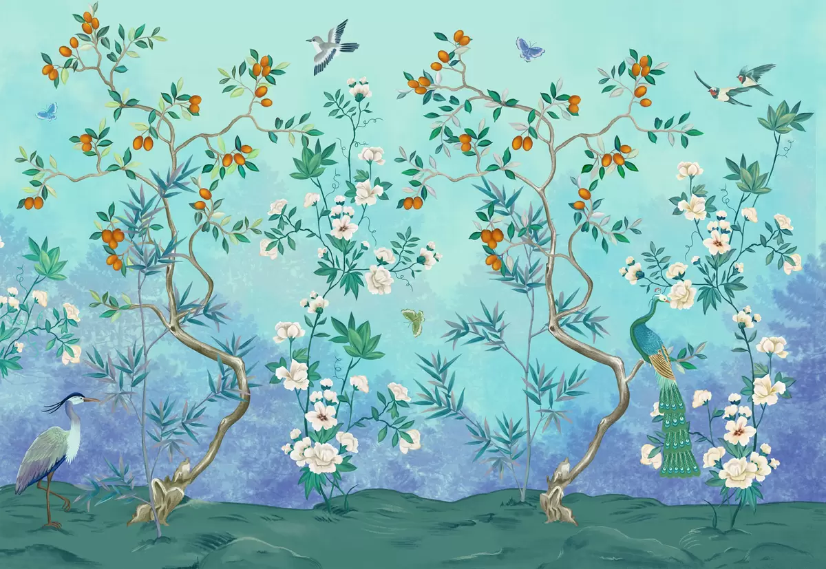 Fototapeedid Stseen puude, lillede ja lindudega, sinine taust Nr w05004v2