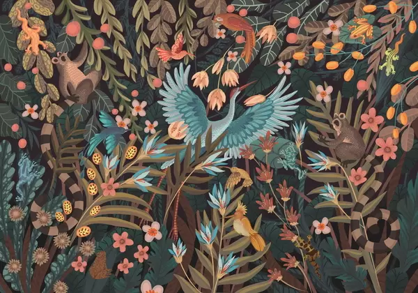 Fototapeedid Fantaasiastseen lindude ja loomadega taimede keskel Nr w05024