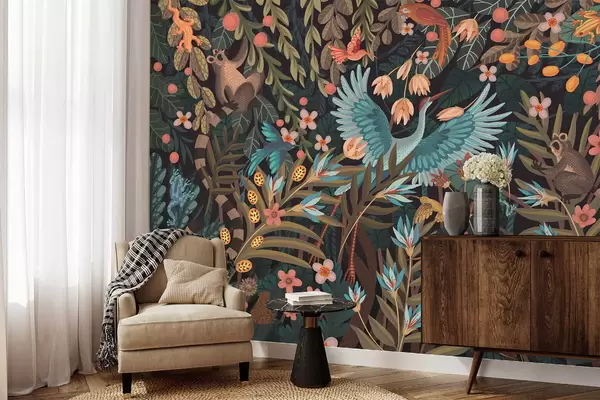 Fototapeedid Fantaasiastseen lindude ja loomadega taimede keskel Nr w05024