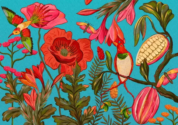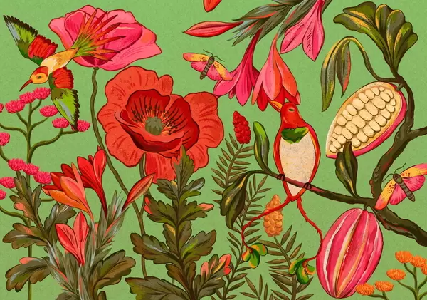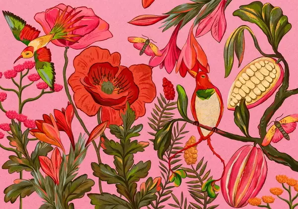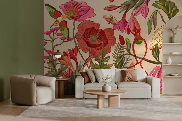 Fototapeedid Dekoratiivsed lilled ja linnud beežil taustal Nr w05036