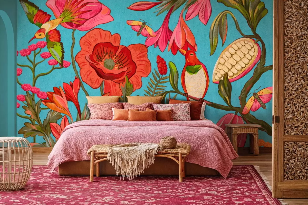 Fototapeedid Dekoratiivsed lilled ja linnud sinisel taustal Nr w05036v3
