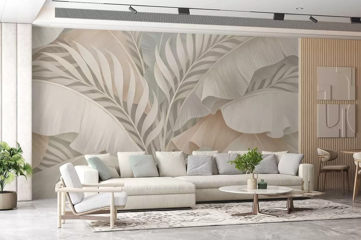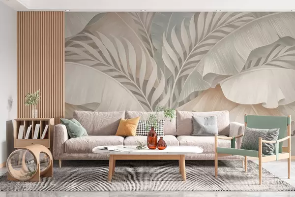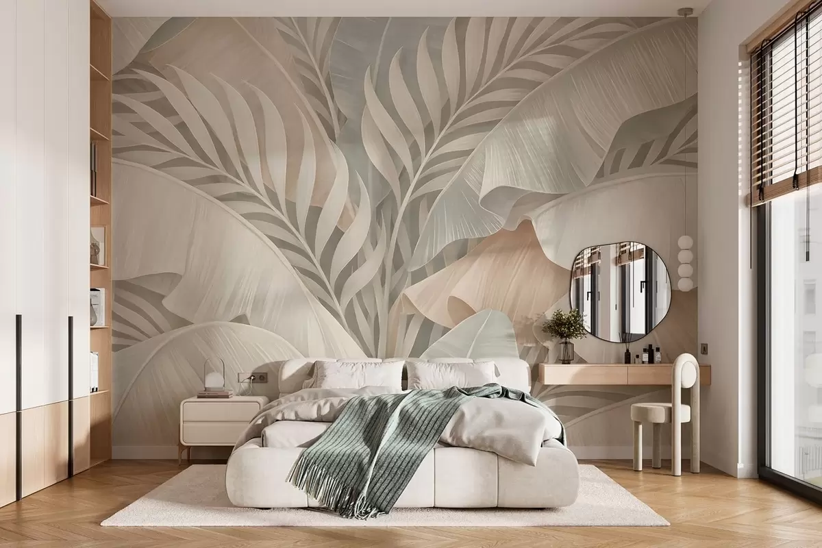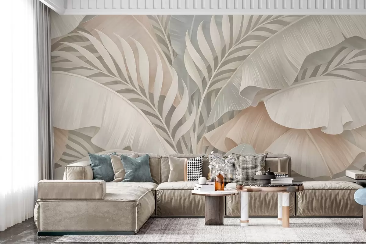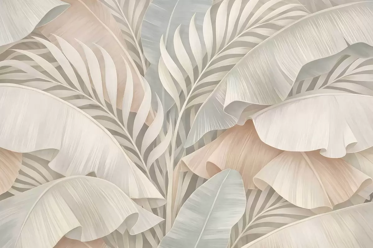 Fototapeedid suured troopilised lehed virsiku ja tuhmi türkiisi toonides Nr w05062