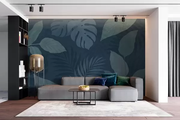 Fototapeedid tekstuuriga troopilised lehed tumesinisel taustal Nr w05063v3