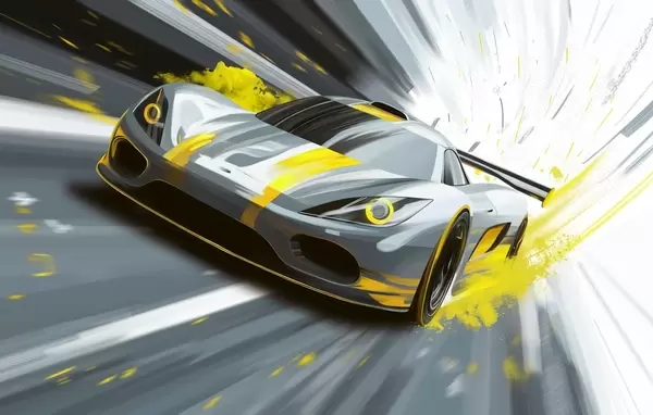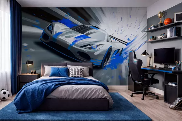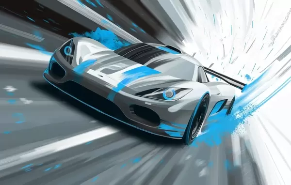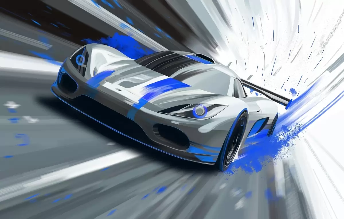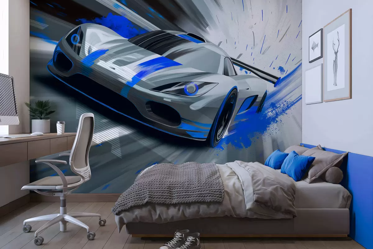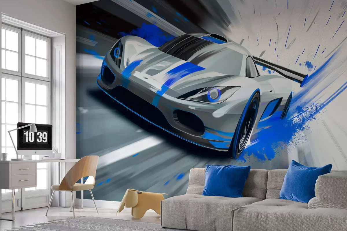 Fototapeedid dünaamiline sportauto digitaalses joonistusstiilis siniste aksentidega Nr w05069