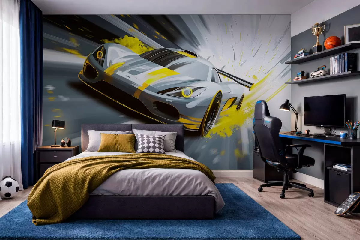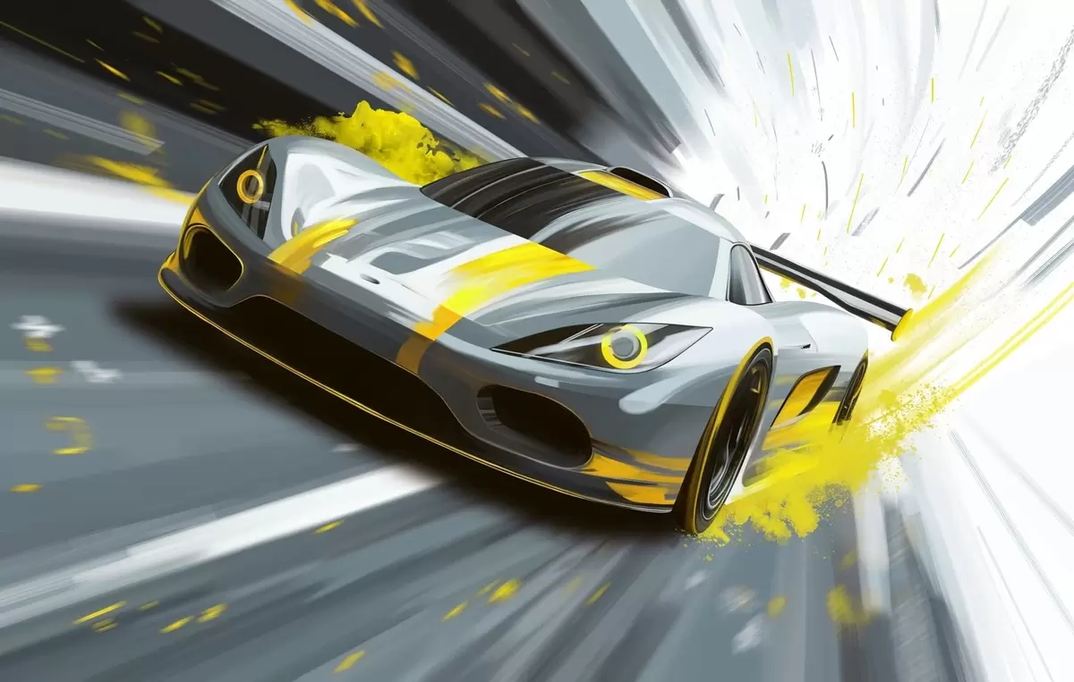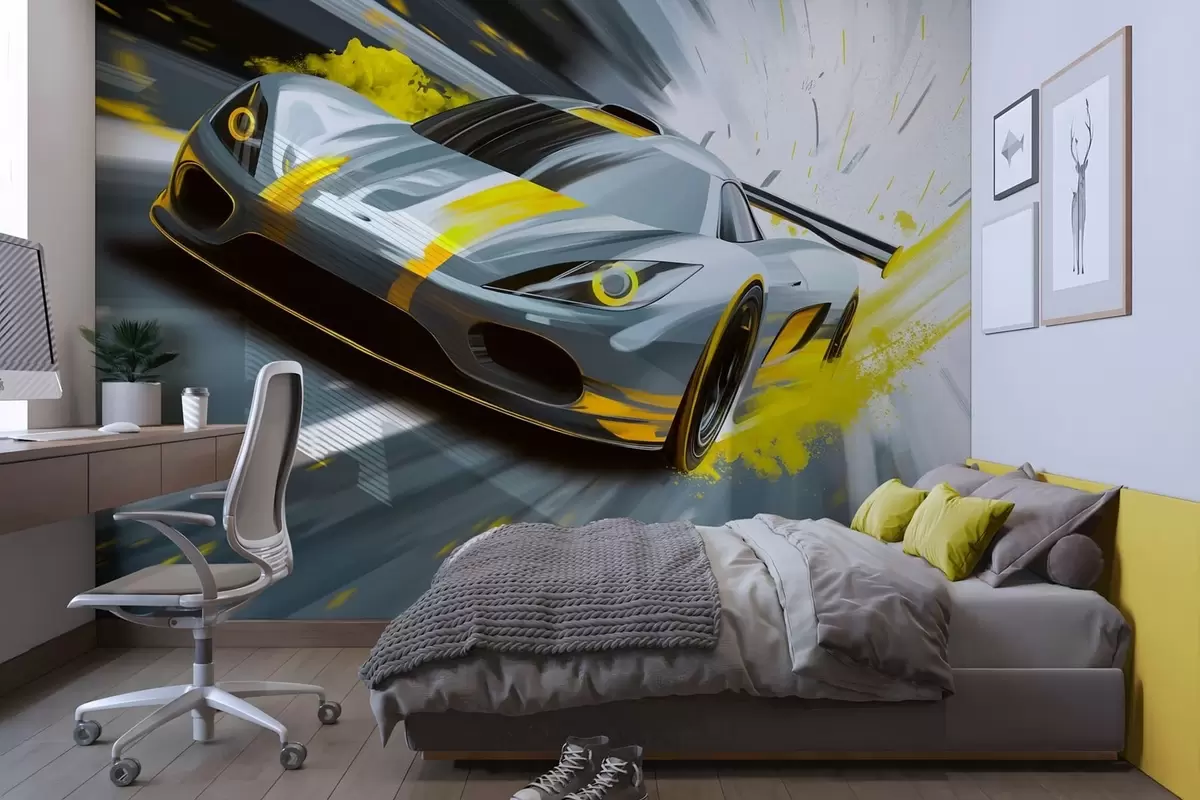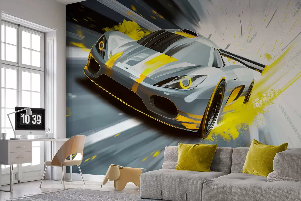 Fototapeedid dünaamiline sportauto digitaalses joonistusstiilis kollaste aksentidega Nr w05069v2