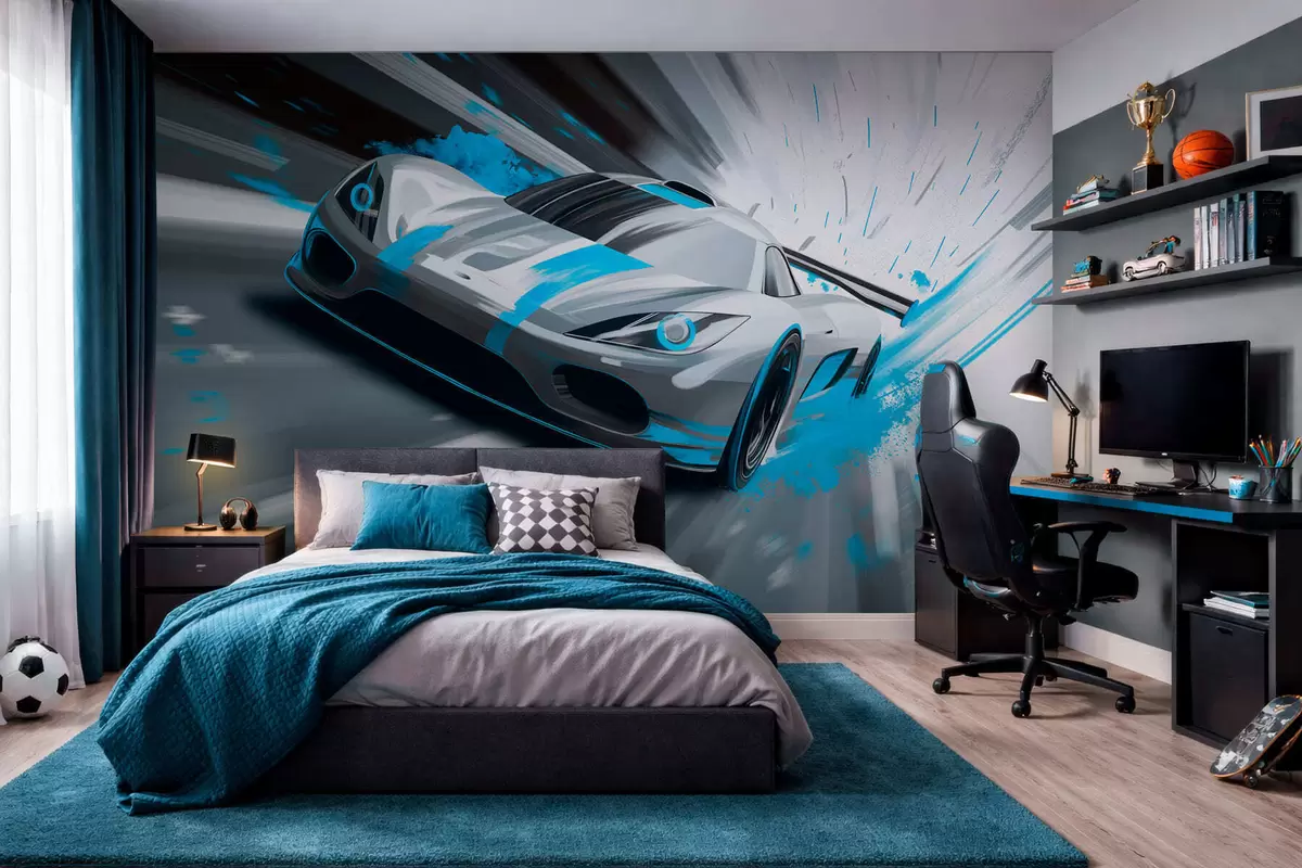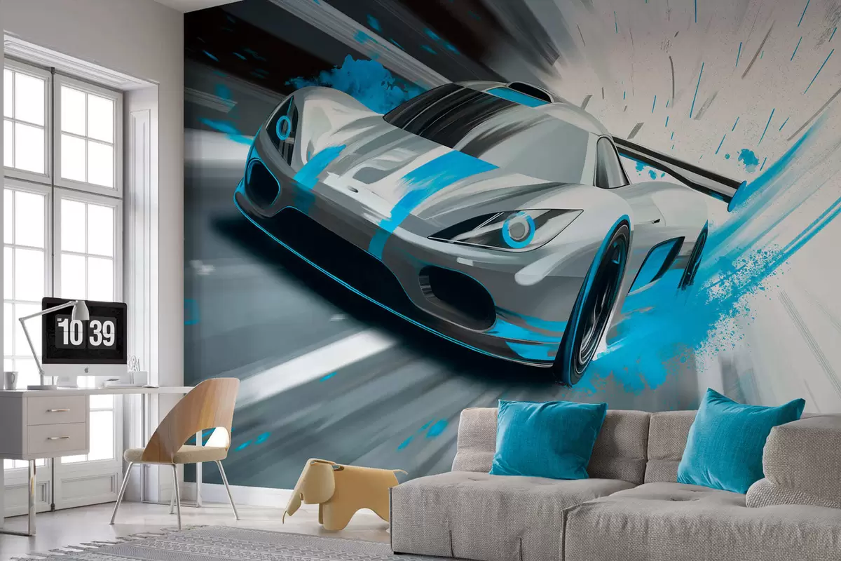 Fototapeedid dünaamiline sportauto digitaalses joonistusstiilis türkiissiniste aksentidega Nr w05069v3