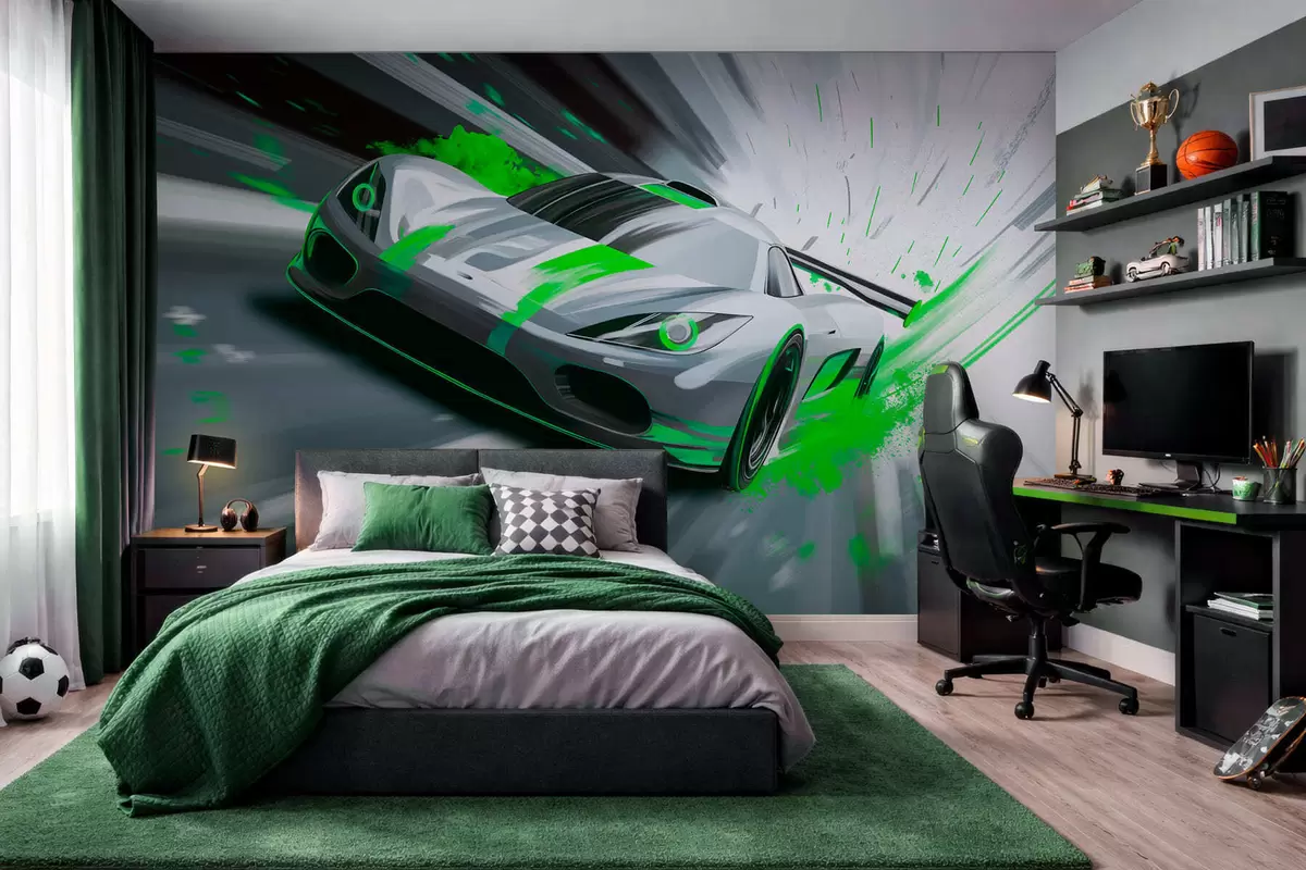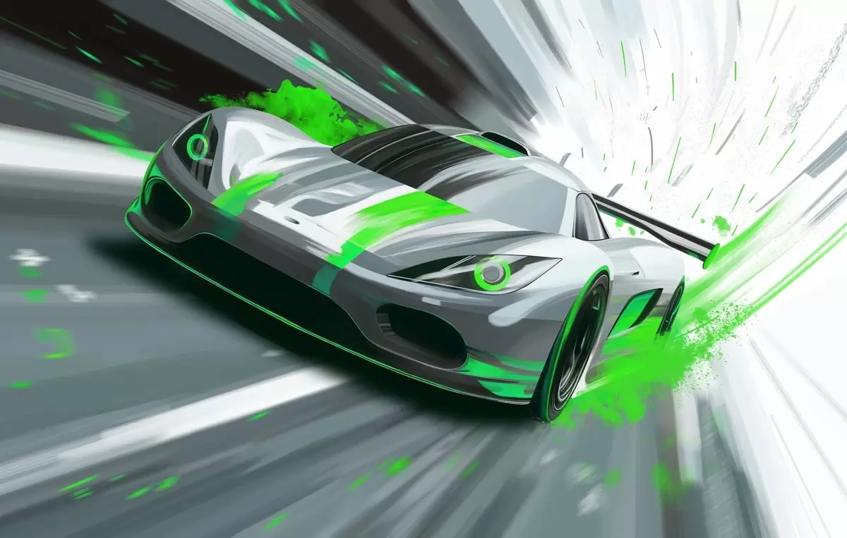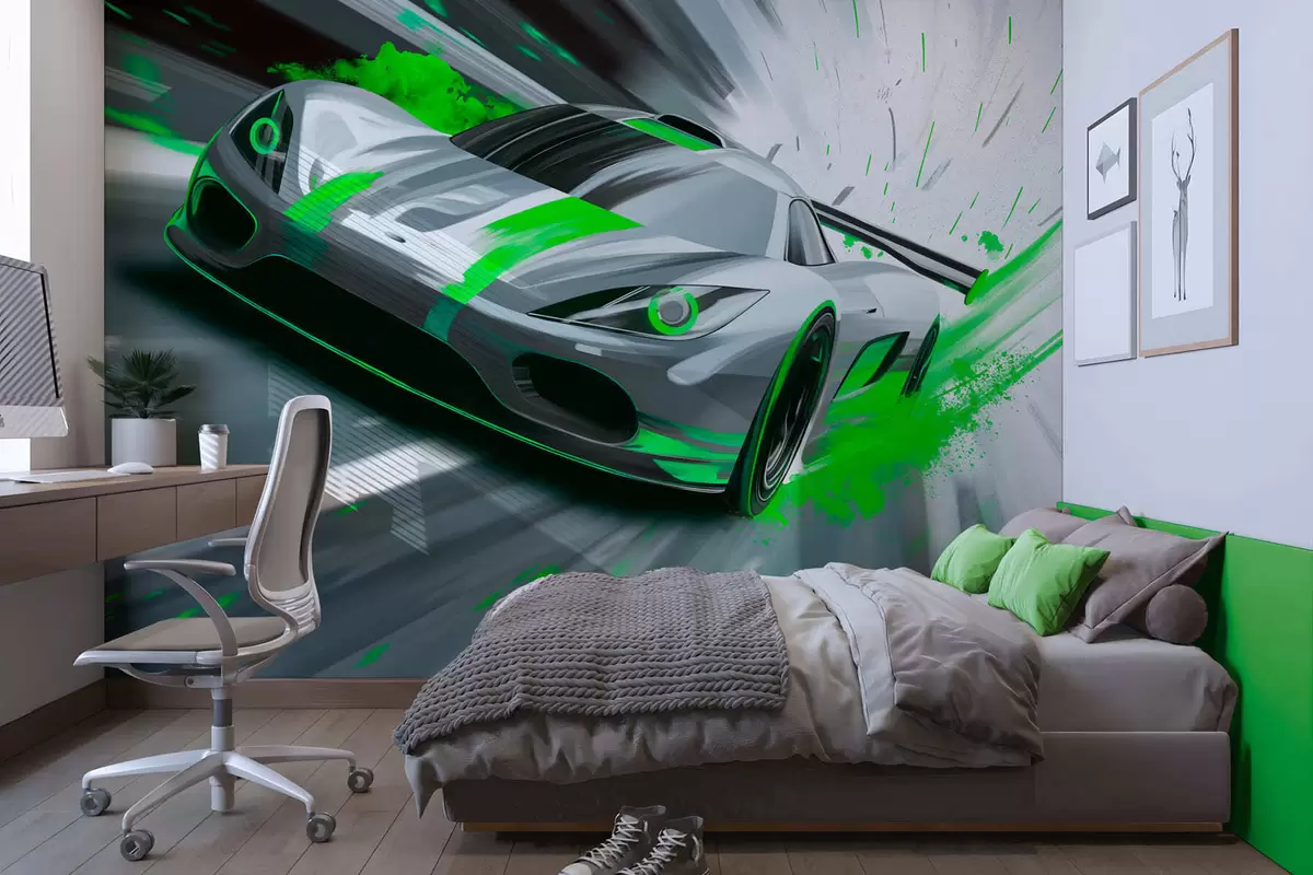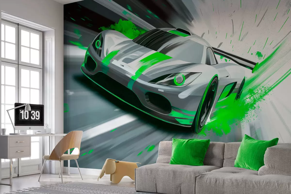 Fototapeedid dünaamiline sportauto digitaalses joonistusstiilis roheliste aksentidega Nr w05069v4