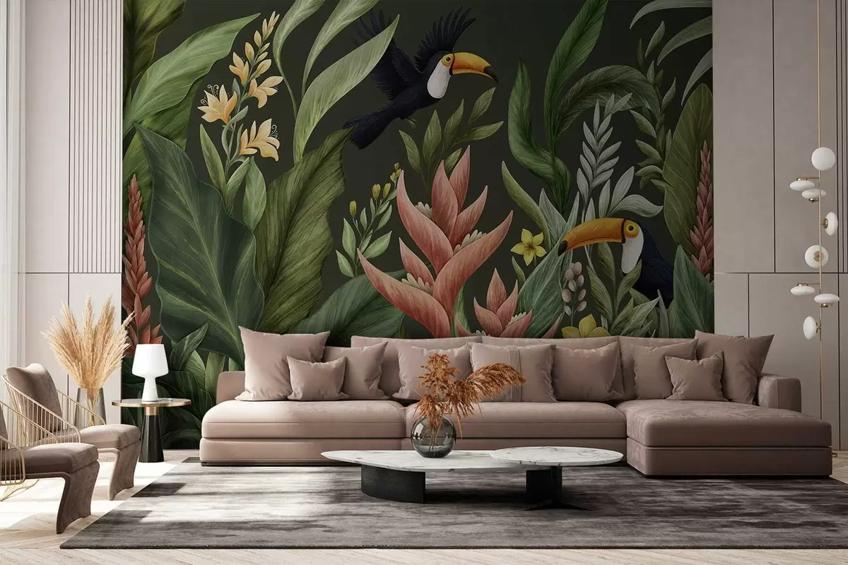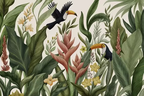 Fototapeedid Troopilised taimed ja suure nokaga linnud heledal taustal Nr w05088