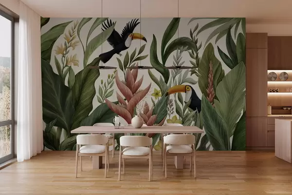 Fototapeedid Troopilised taimed ja suure nokaga linnud heledal taustal Nr w05088v1