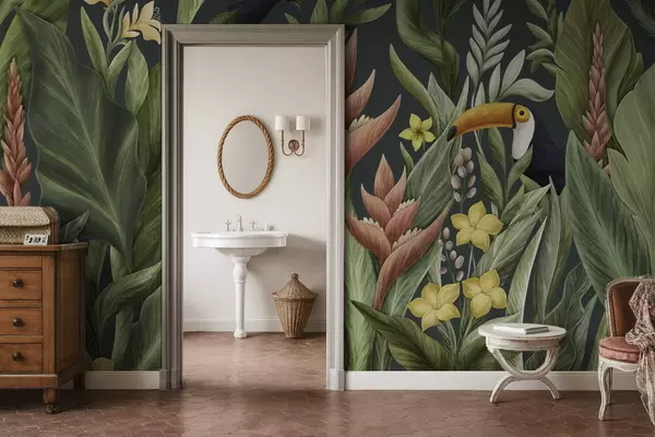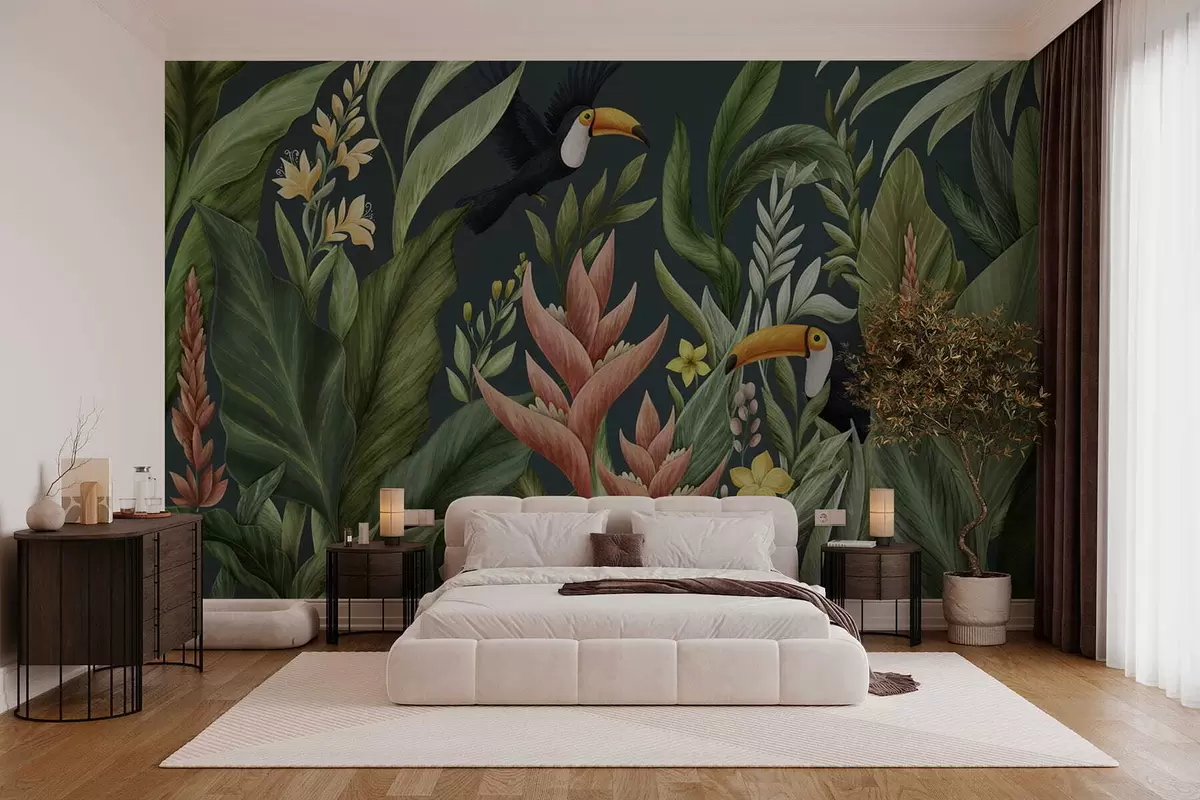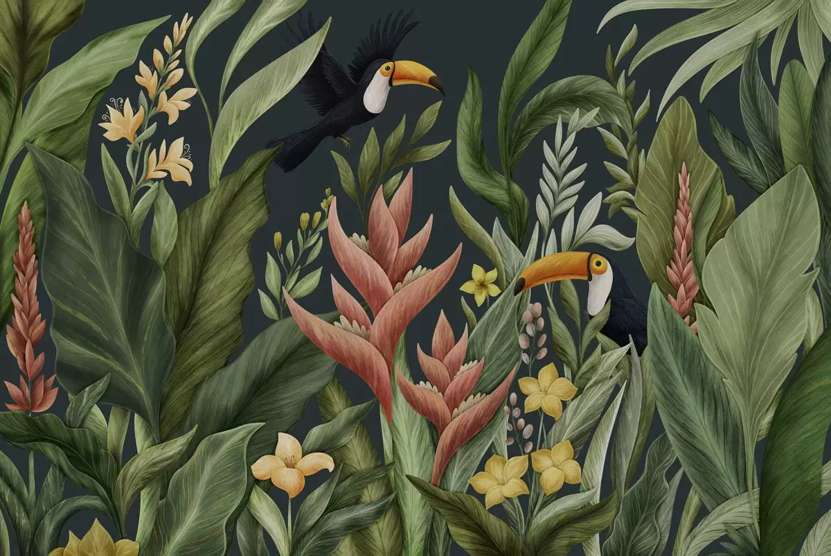 Fototapeedid Troopilised taimed ja suurnokk-linnud tumedal taustal Nr w05088v2