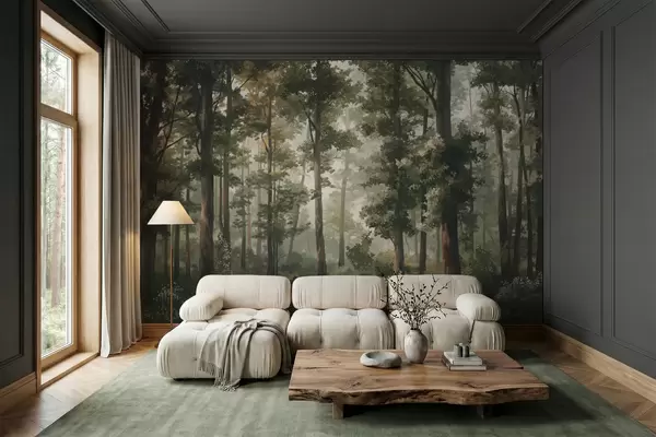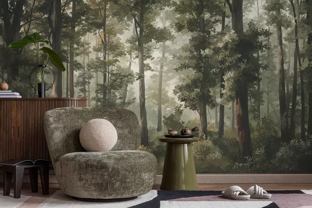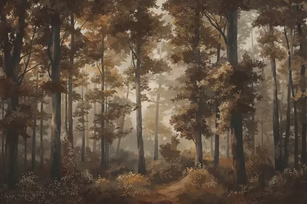 Fototapeedid Metsaillustratsioon uduga, kõrgete puude ja teega Nr w05089