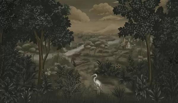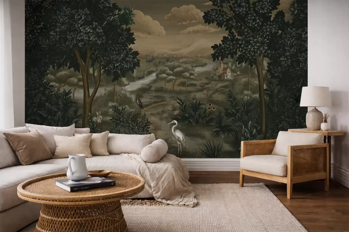 Fototapeedid Fantaasiamaastik jõega, majaga ja lindudega puude vahel Nr w05090