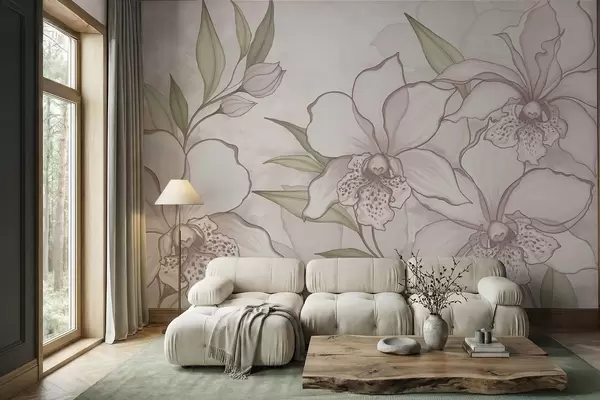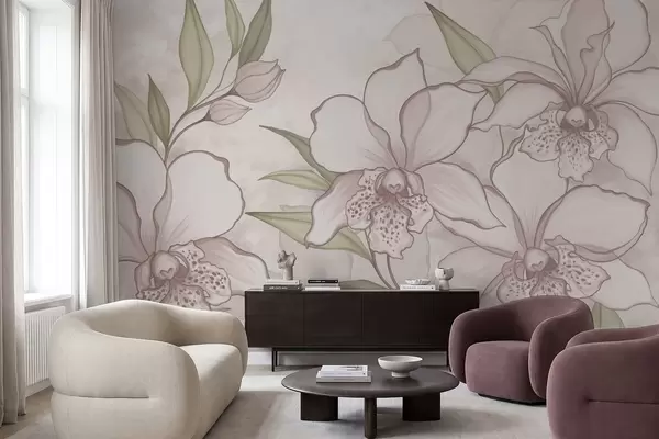 Fototapeedid Illustratsioon kahvatutest orhideedest lehtedega beežil taustal Nr w05117