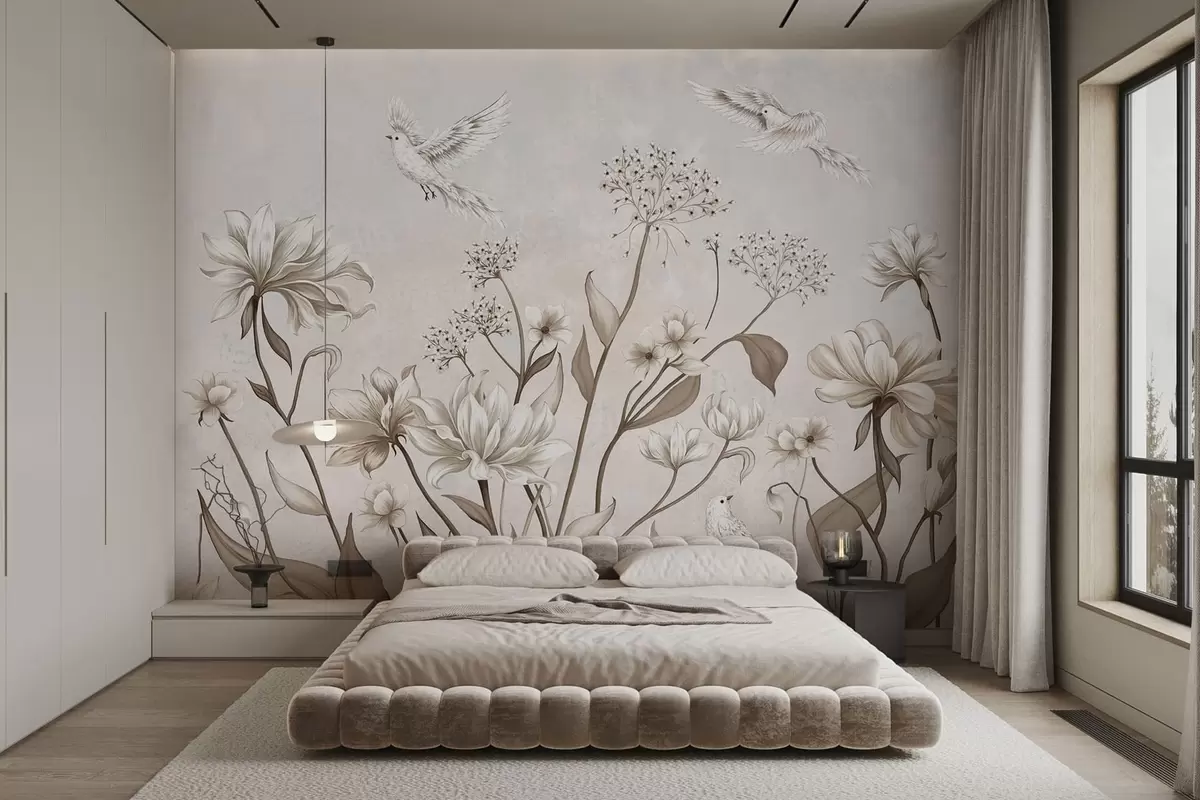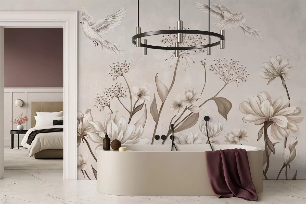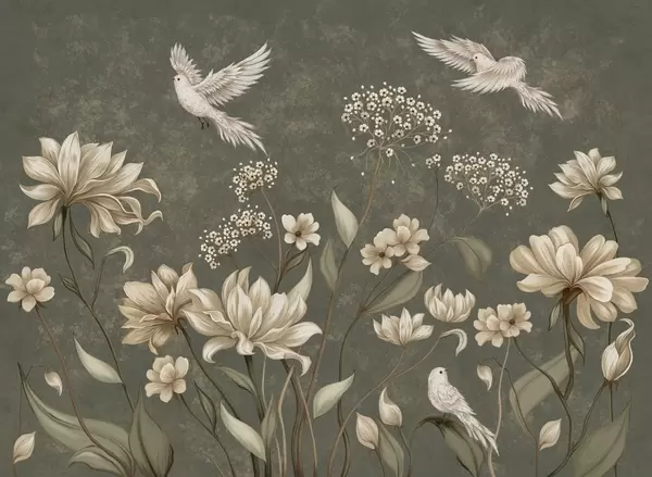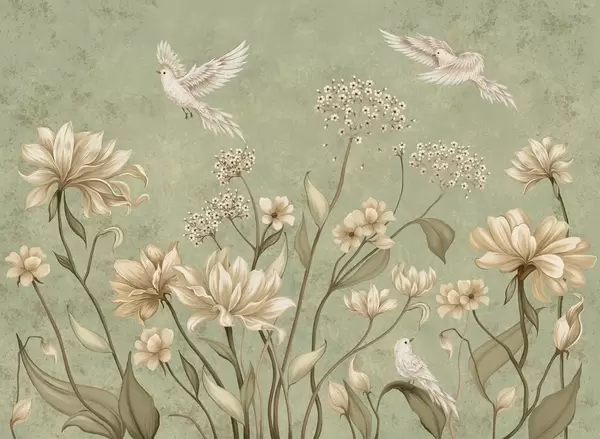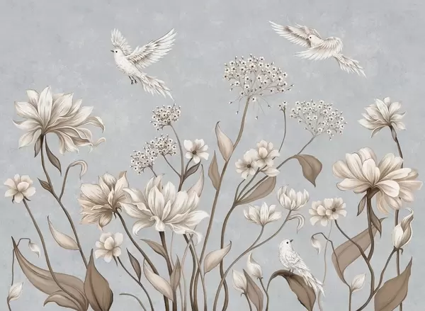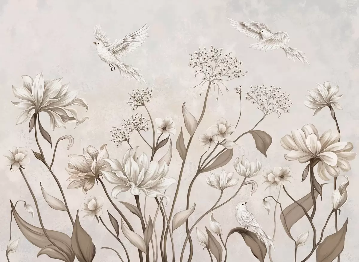 Fototapeedid Kerged lilled ja linnud pehmel taustal Nr w05118