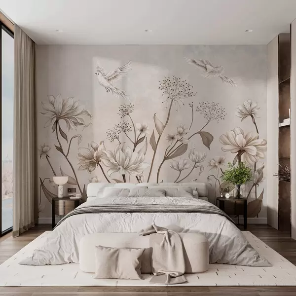 Fototapeedid Kerged lilled ja linnud pehmel taustal Nr w05118