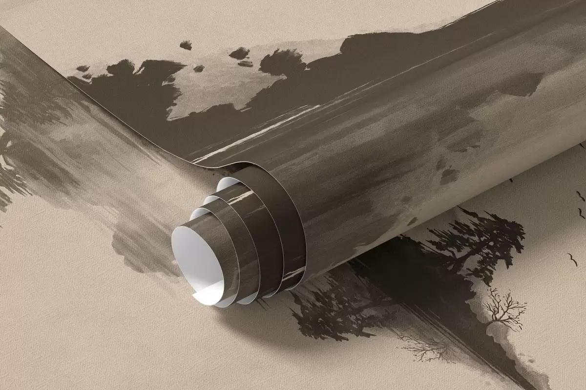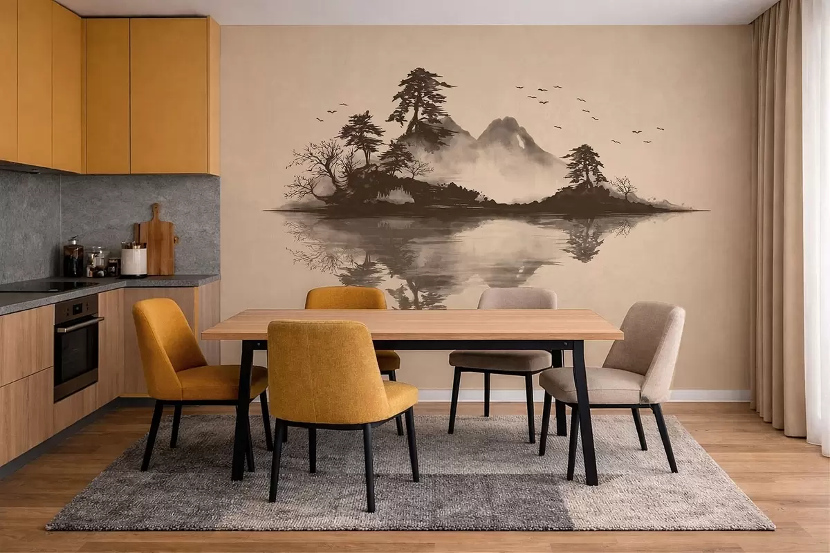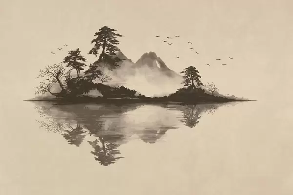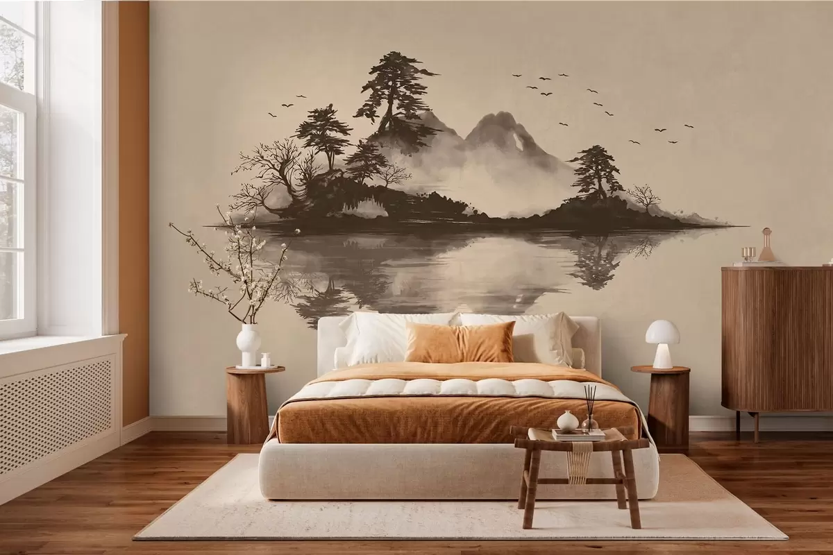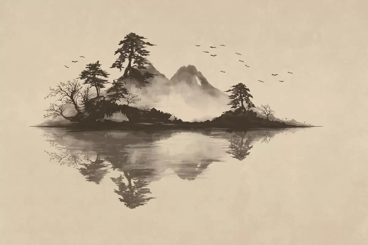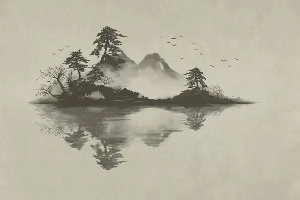 Fototapeedid Sumi-e mägimaastik mändide ja peegeldusega Nr w05124