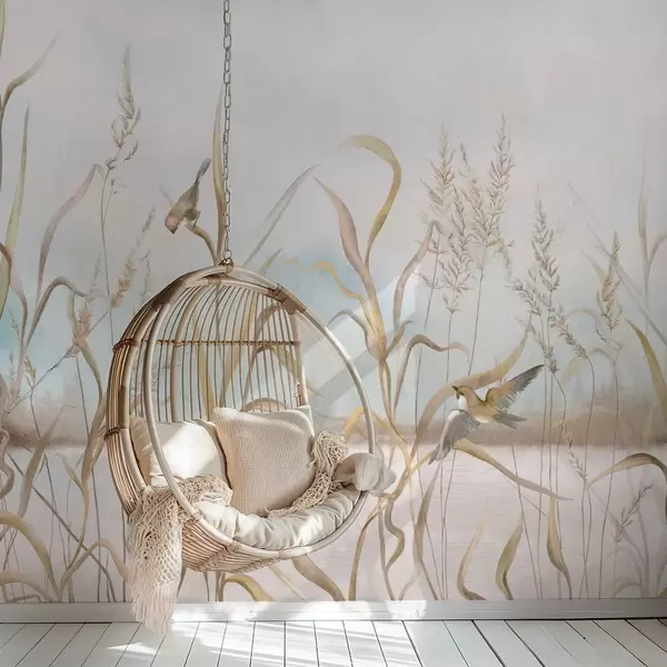 Fototapeedid Illustratsioon pilliroost ja lindudest vee ääres pehmetes toonides Nr w05125