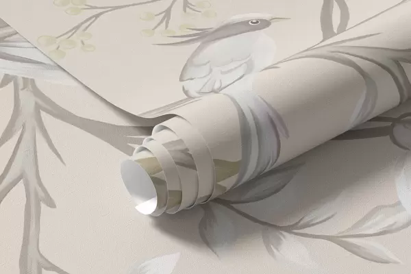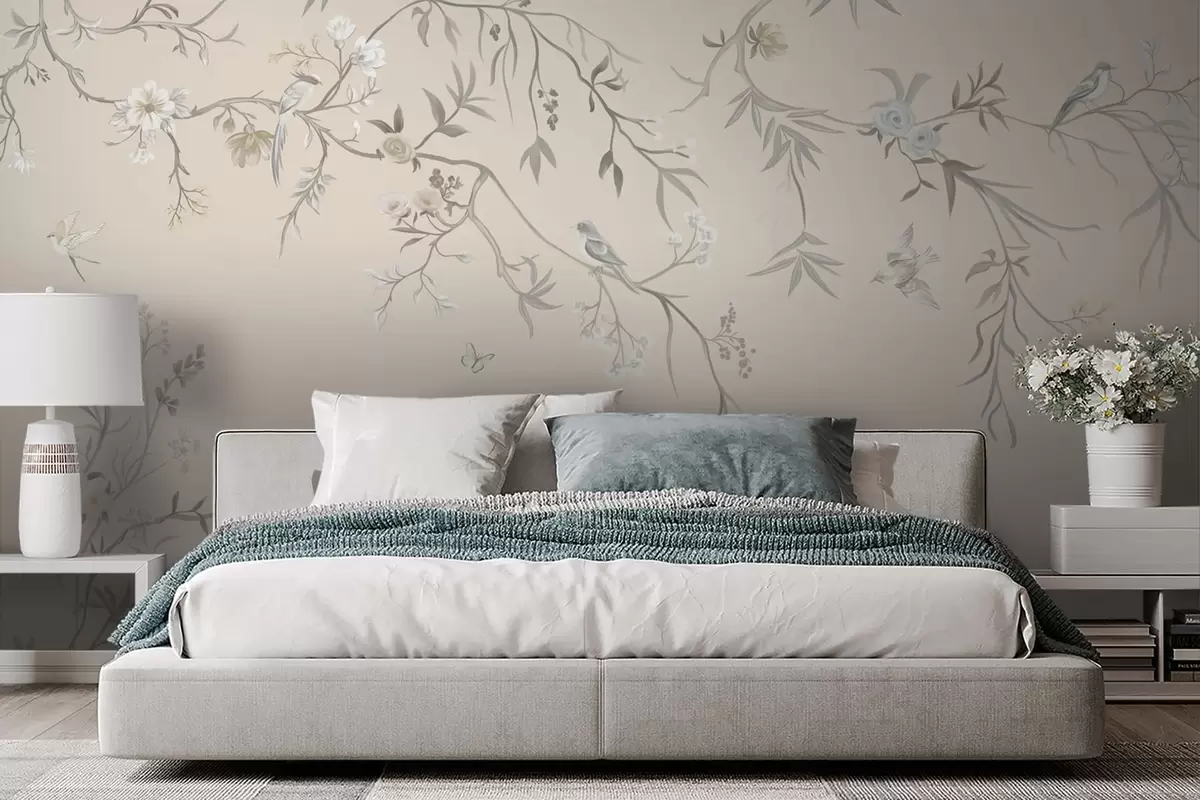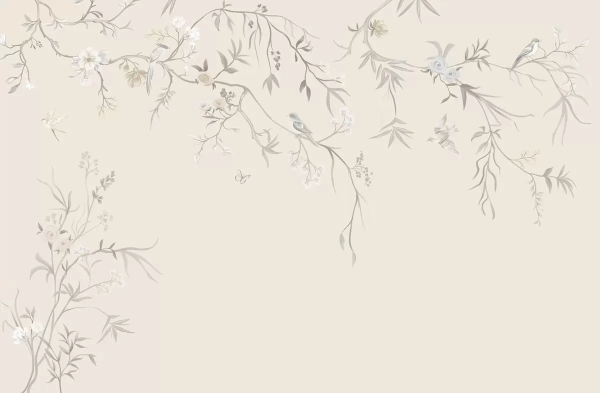 Fototapeedid Lillelised oksad lindudega heledal taustal Nr w05127v7