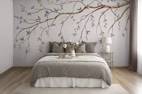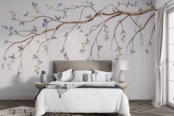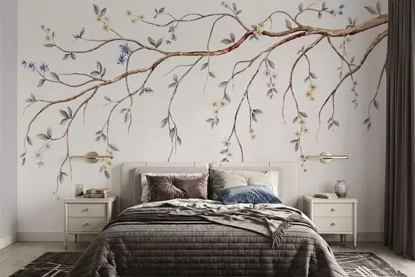 Fototapeedid Õhukesed oksad väikeste õitega heledal taustal Nr w05145