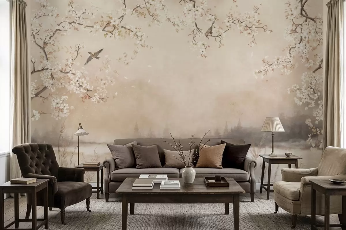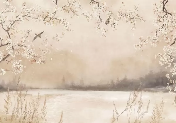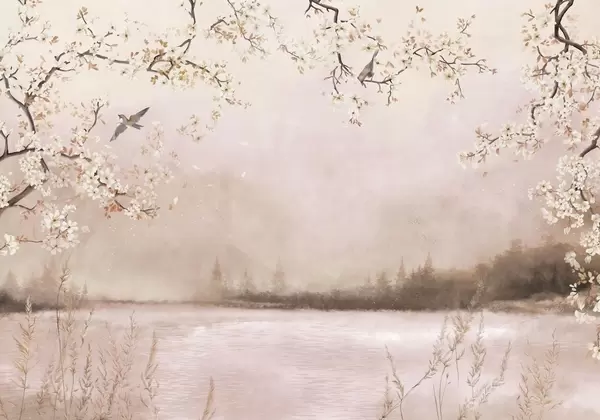 Fototapeedid Õrnalt õitsevad oksad järve ääres, kus kerge udu sees lendlevad linnud Nr w05155