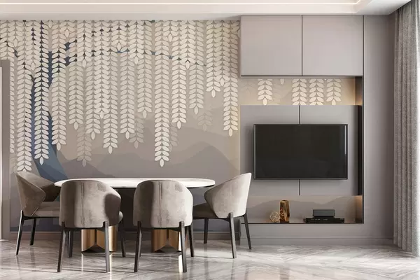 Fototapeedid stiliseeritud paju puu rippuvate lehtedega minimalistlike mägedega taustal, beeži ja sinakasrohelistes toonides Nr w05232