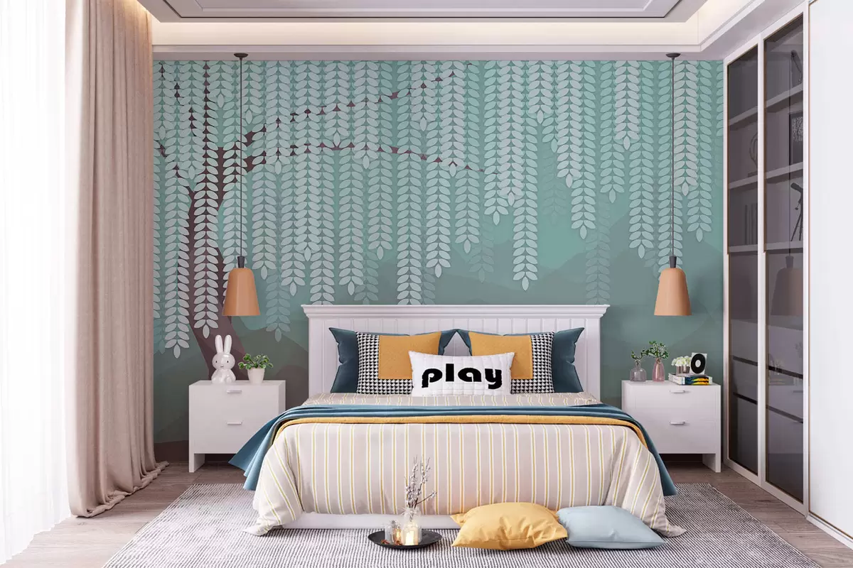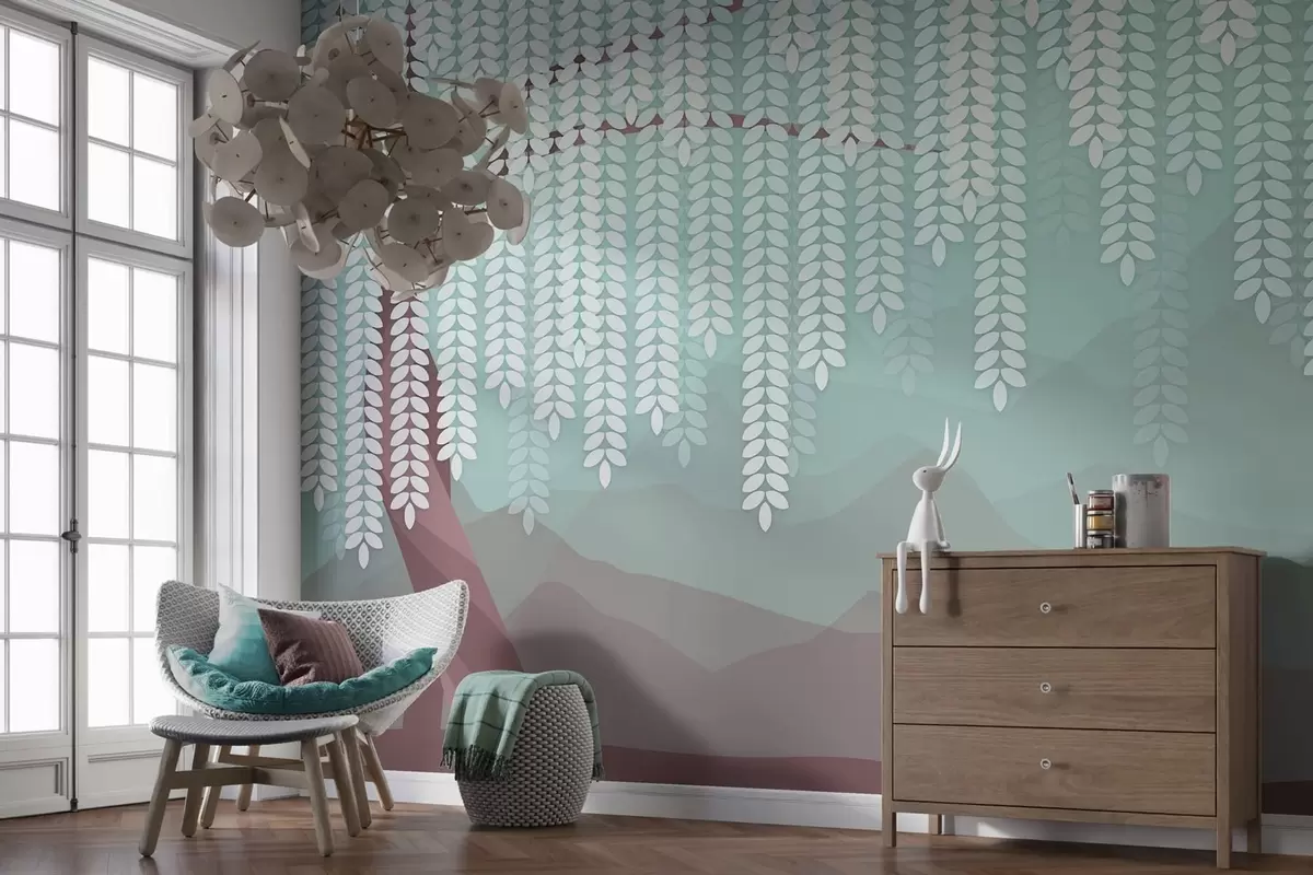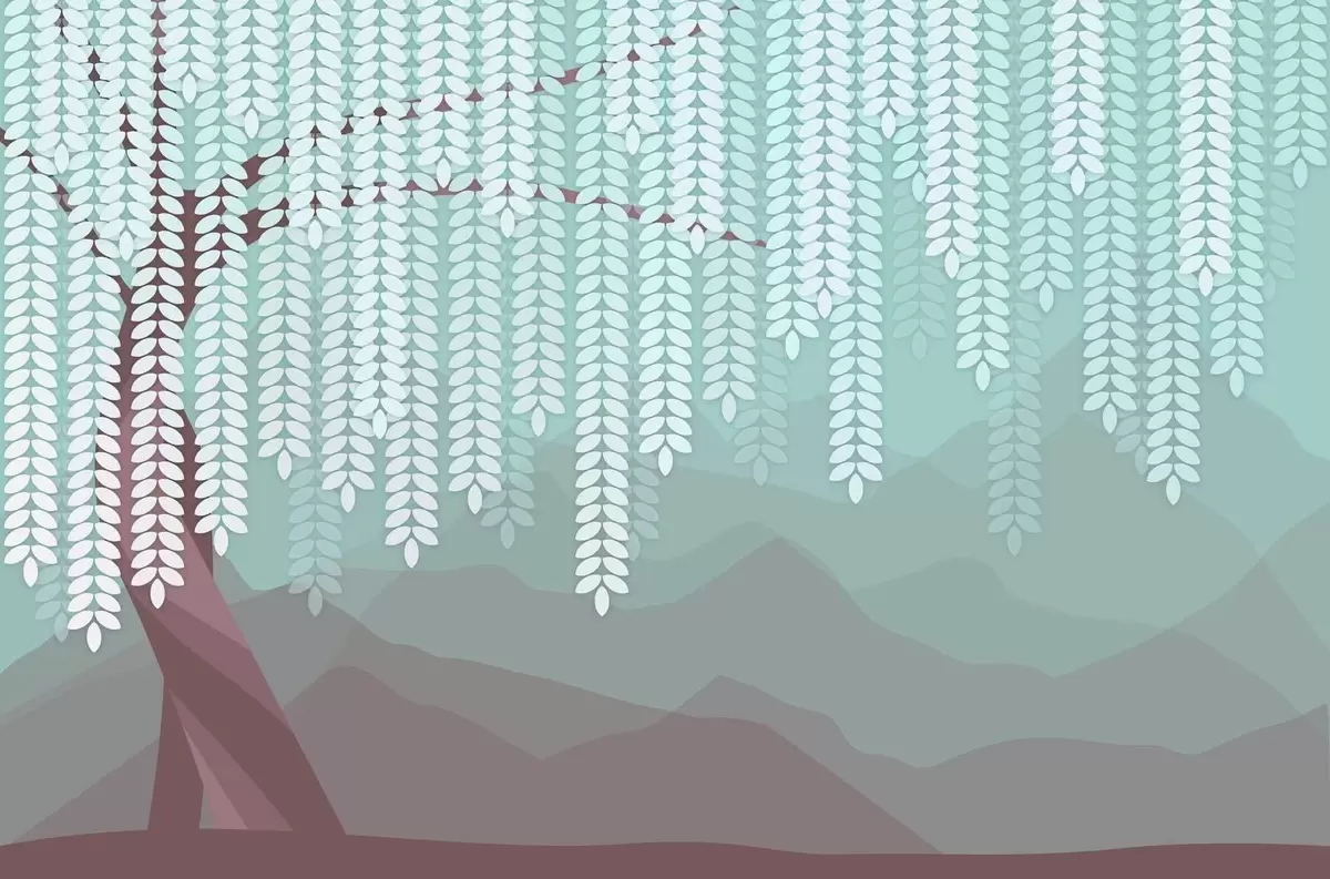 Fototapeedid stiliseeritud paju puu rippuvate lehtedega minimalistlike šokolaadi- ja türkiissiniste toonidega mägede taustal Nr w05232v1