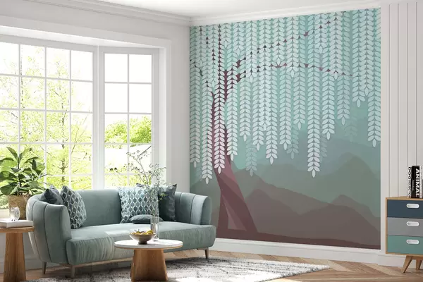 Fototapeedid stiliseeritud paju puu rippuvate lehtedega minimalistlike šokolaadi- ja türkiissiniste toonidega mägede taustal Nr w05232v1