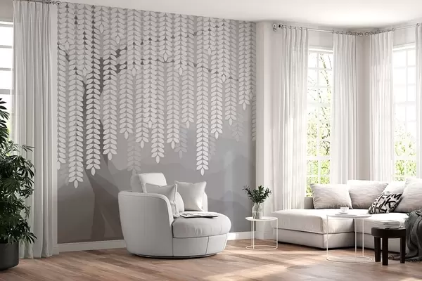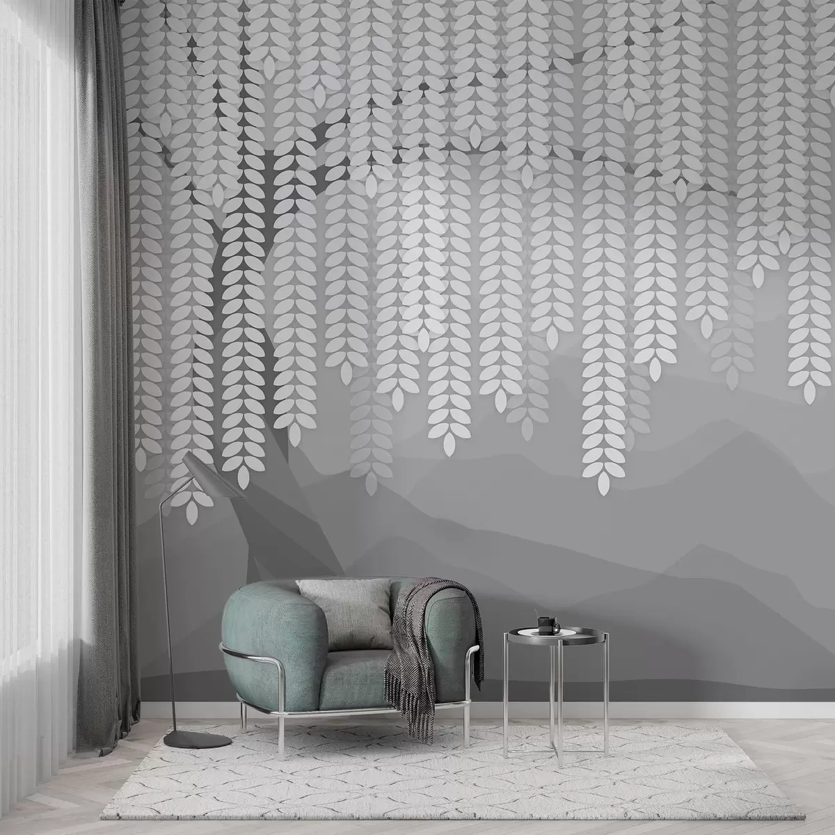 Fototapeedid stiliseeritud paju puu rippuvate lehtedega minimalistlike hallide mägede taustal Nr w05232v3