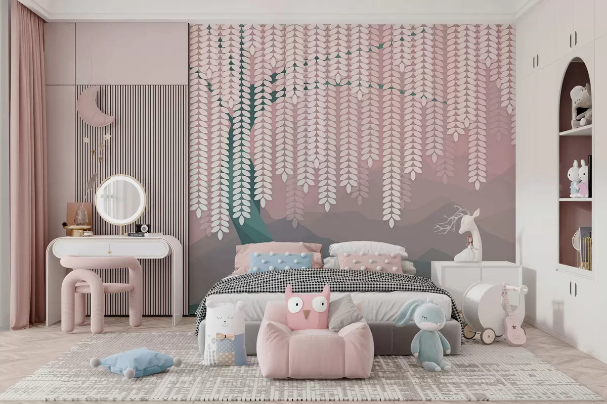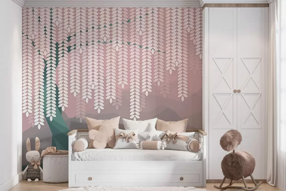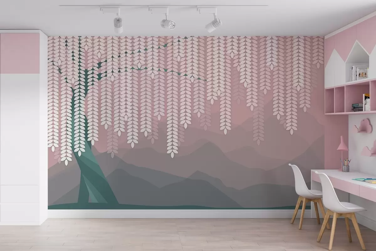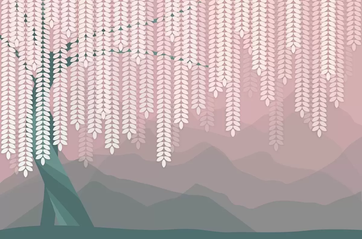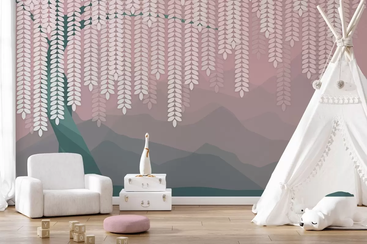 Fototapeedid stiliseeritud paju puu rippuvate lehtedega minimalistlike roosa ja tumeroheliste mägede taustal Nr w05232v4