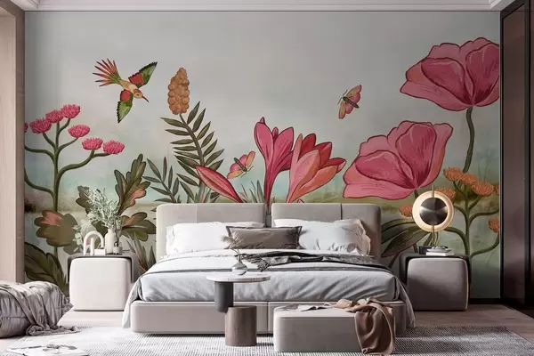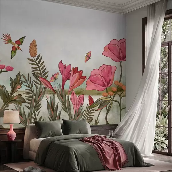 Fototapeedid Ere värvilised lilled lindude ja liblikatega Nr w05321
