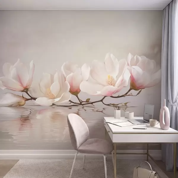 Fototapeedid Magnolia oks õitega rahuliku vee peegelduse kohal Nr w05353v1