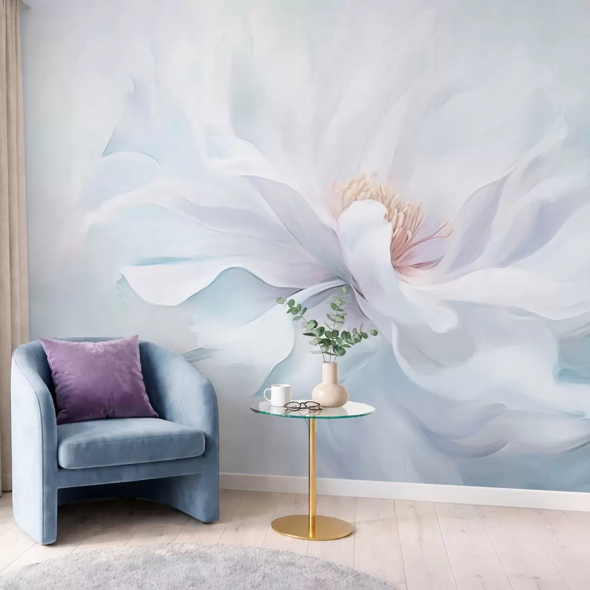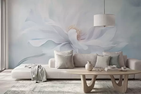 Fototapeedid Pehme valge õis voolavate kroonlehtedega sinisel taustal Nr w05354