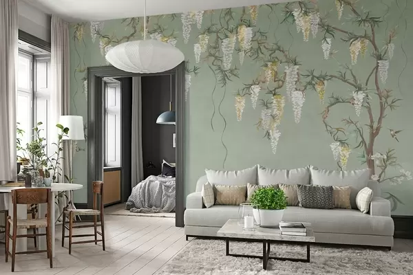 Fototapeedid Õitsvad oksad valgetega õitega ja lindudega rohelisel taustal Nr w05394