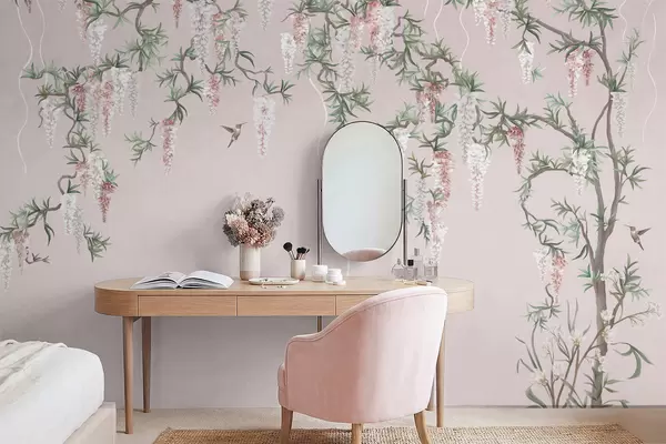 Fototapeedid Õitsvad oksad roosade õitega ja lindudega Nr w05394v1