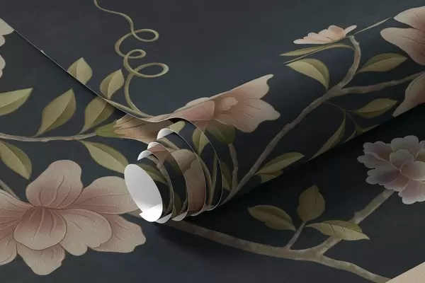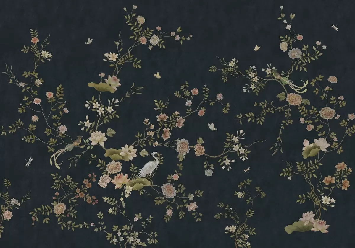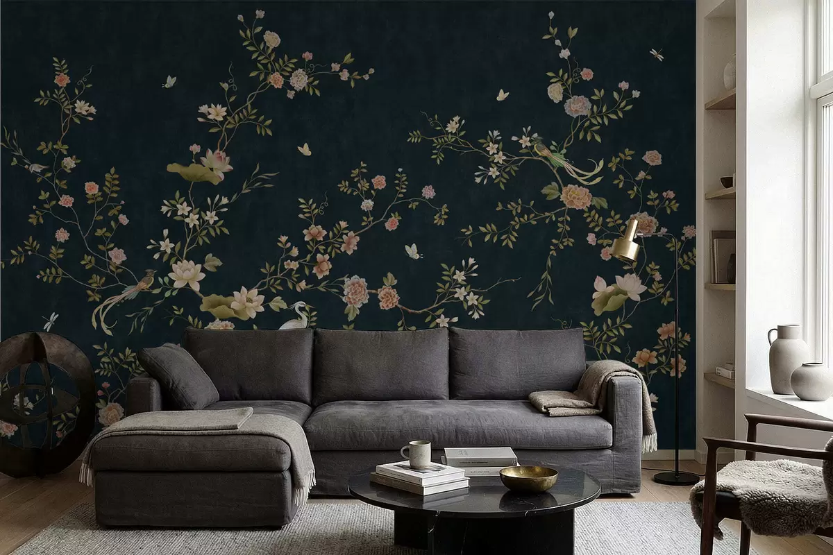 Fototapeedid Õitsvad oksad lindudega tumedal taustal Nr w05416v3