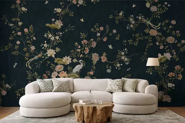 Fototapeedid Õitsvad oksad lindudega tumedal taustal Nr w05416v3