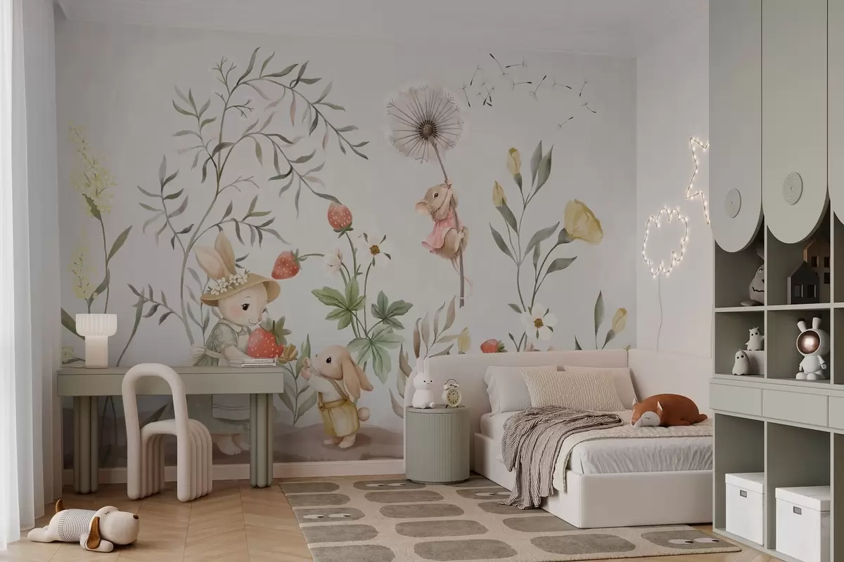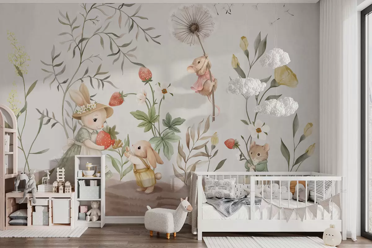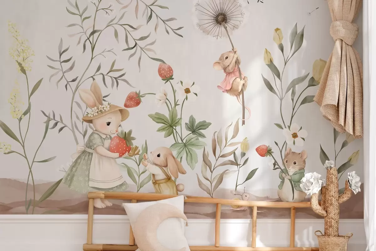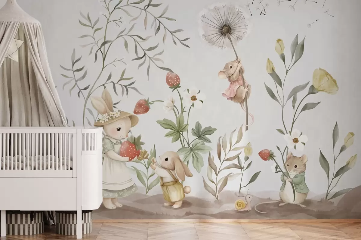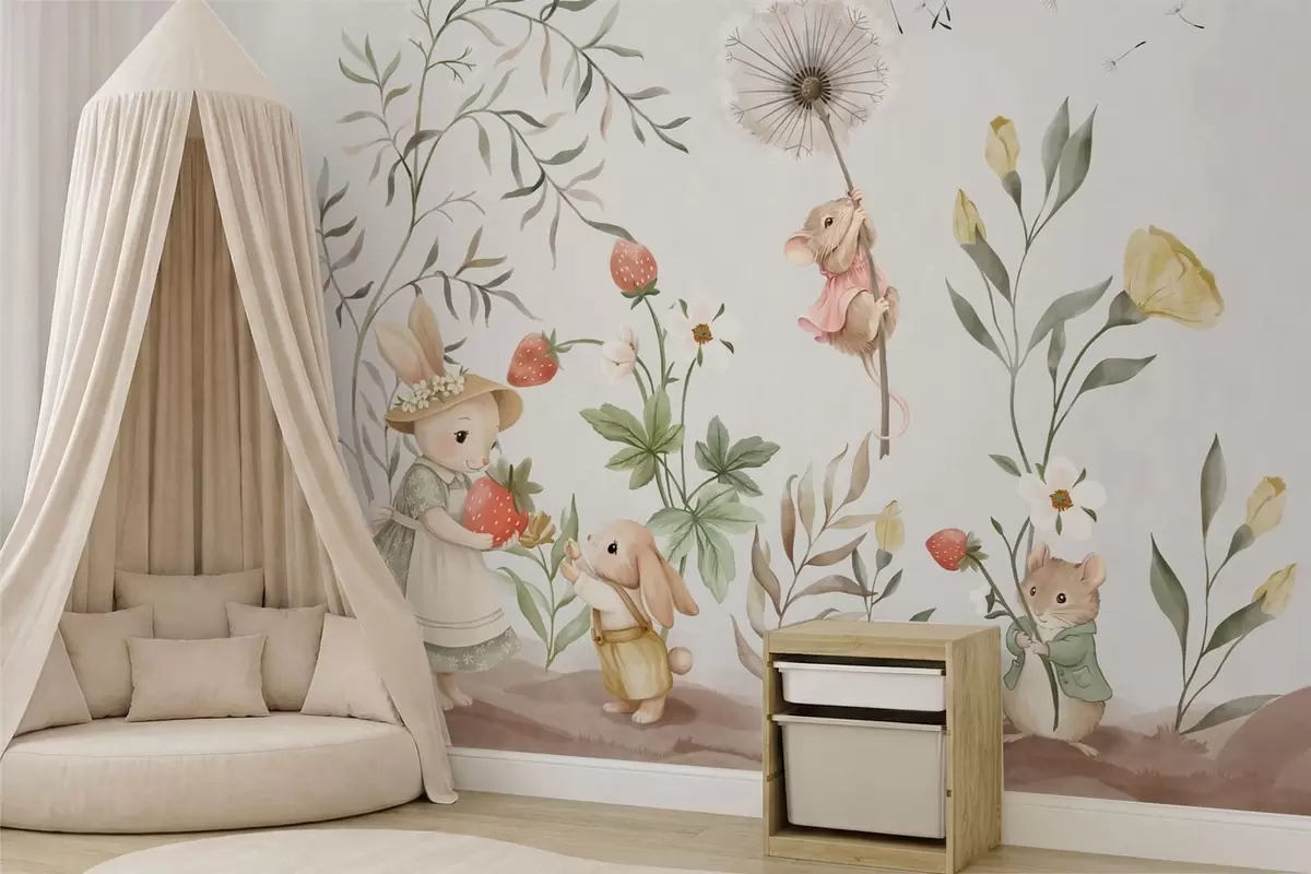 Fototapeedid Lasteillustratsioon, millel on jänes ja hiir taimede ja lillede keskel Nr w05422