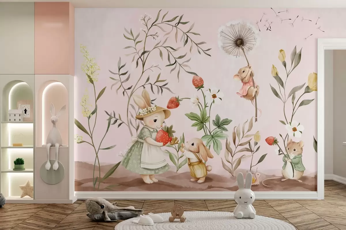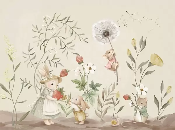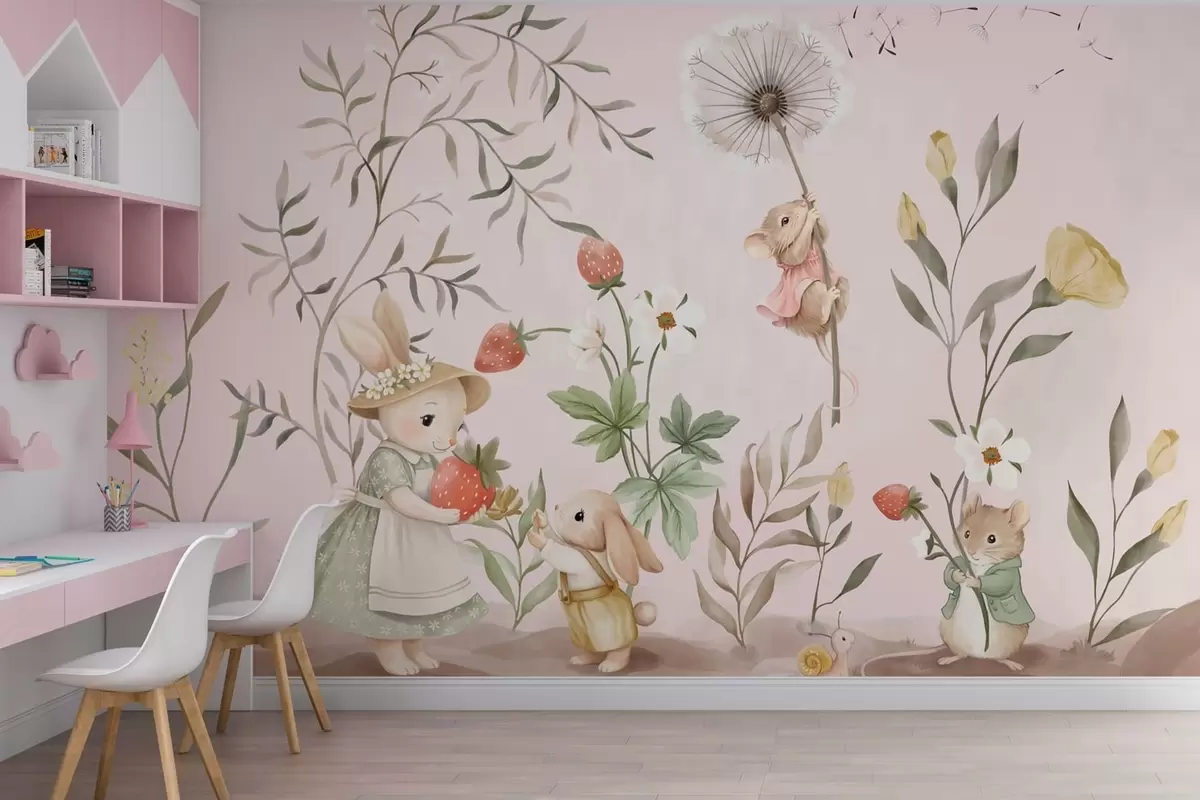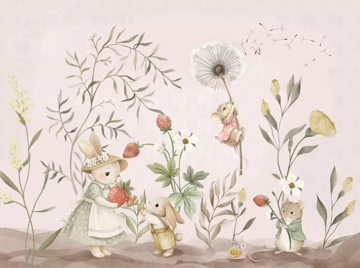 Fototapeedid Loomade illustratsioon maasikatega õrnroosa taustal Nr w05422v1