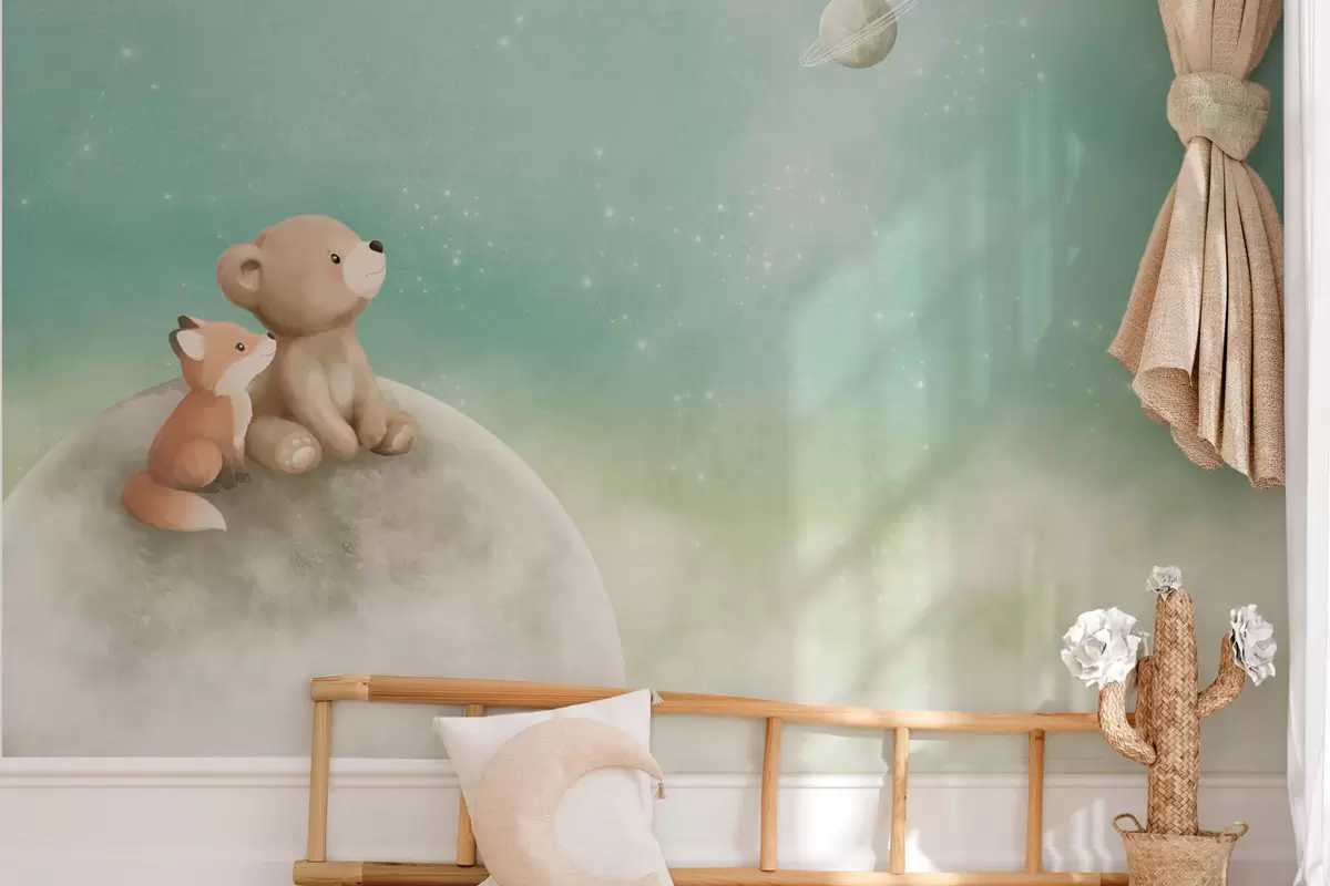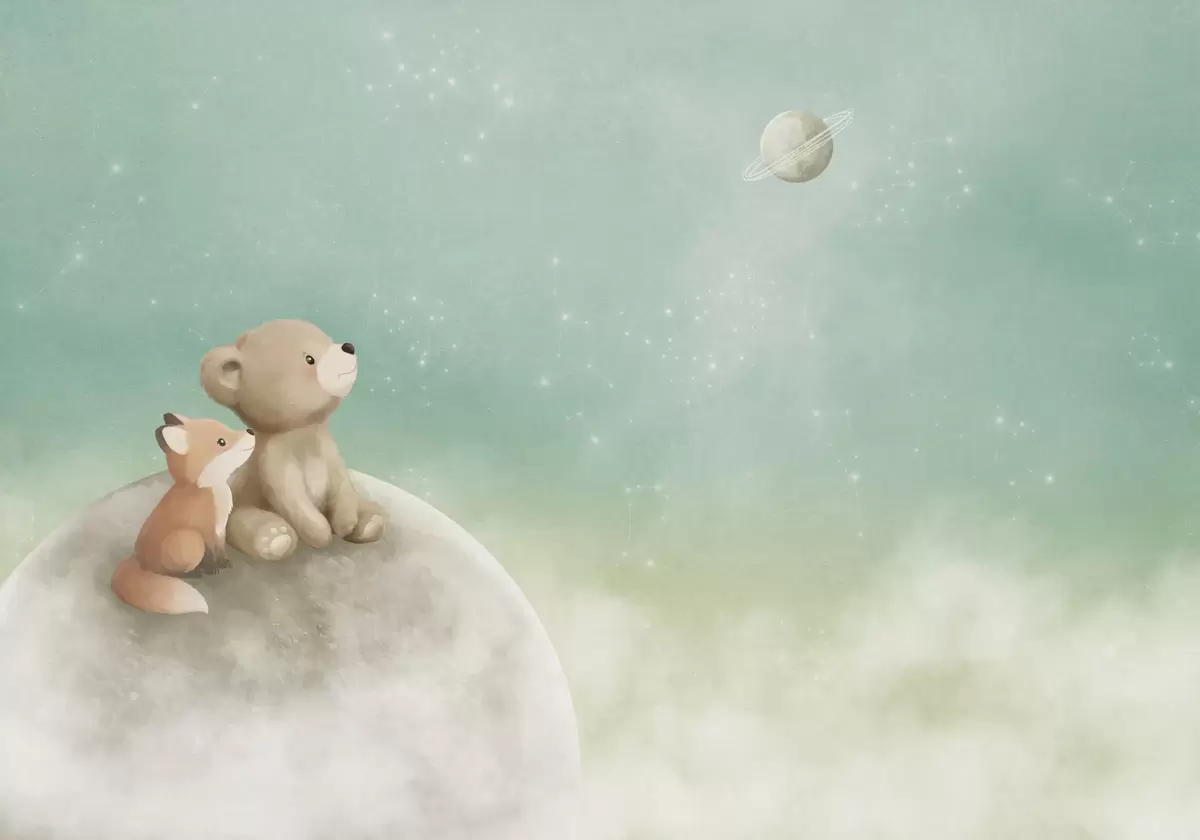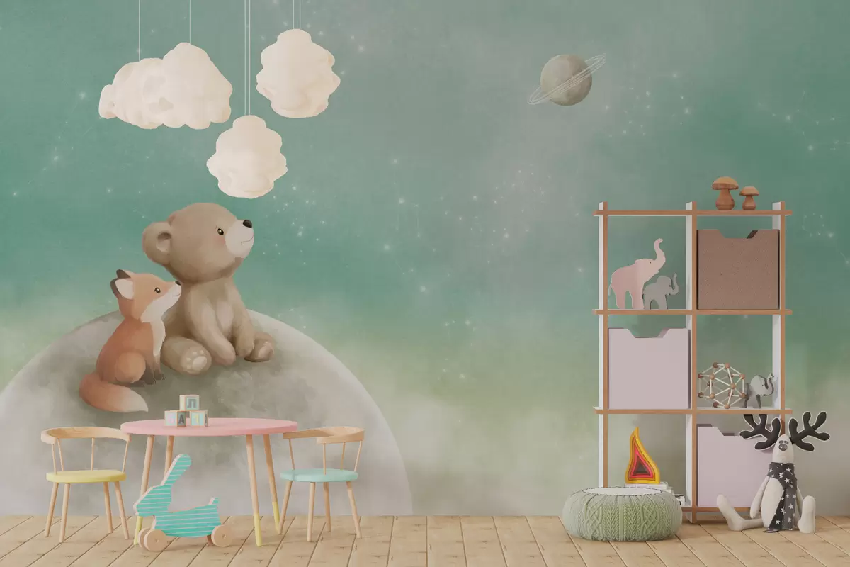 Fototapeedid Pastelljoonistus: karu ja rebane rohelise taeva taustal Nr w05431v1