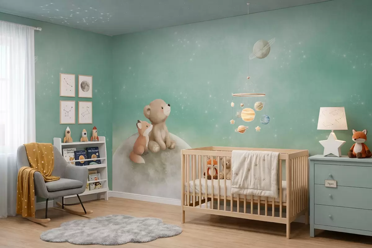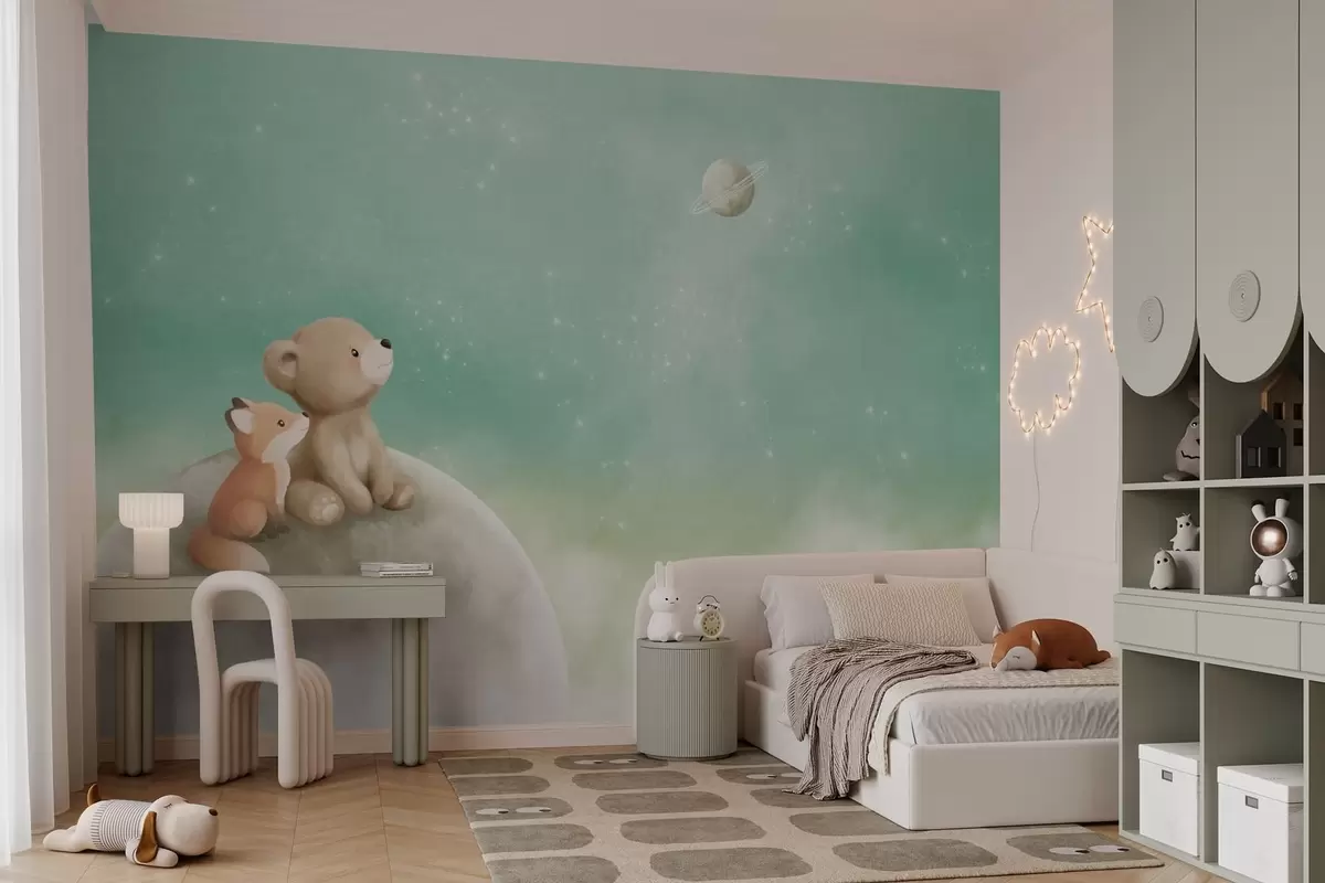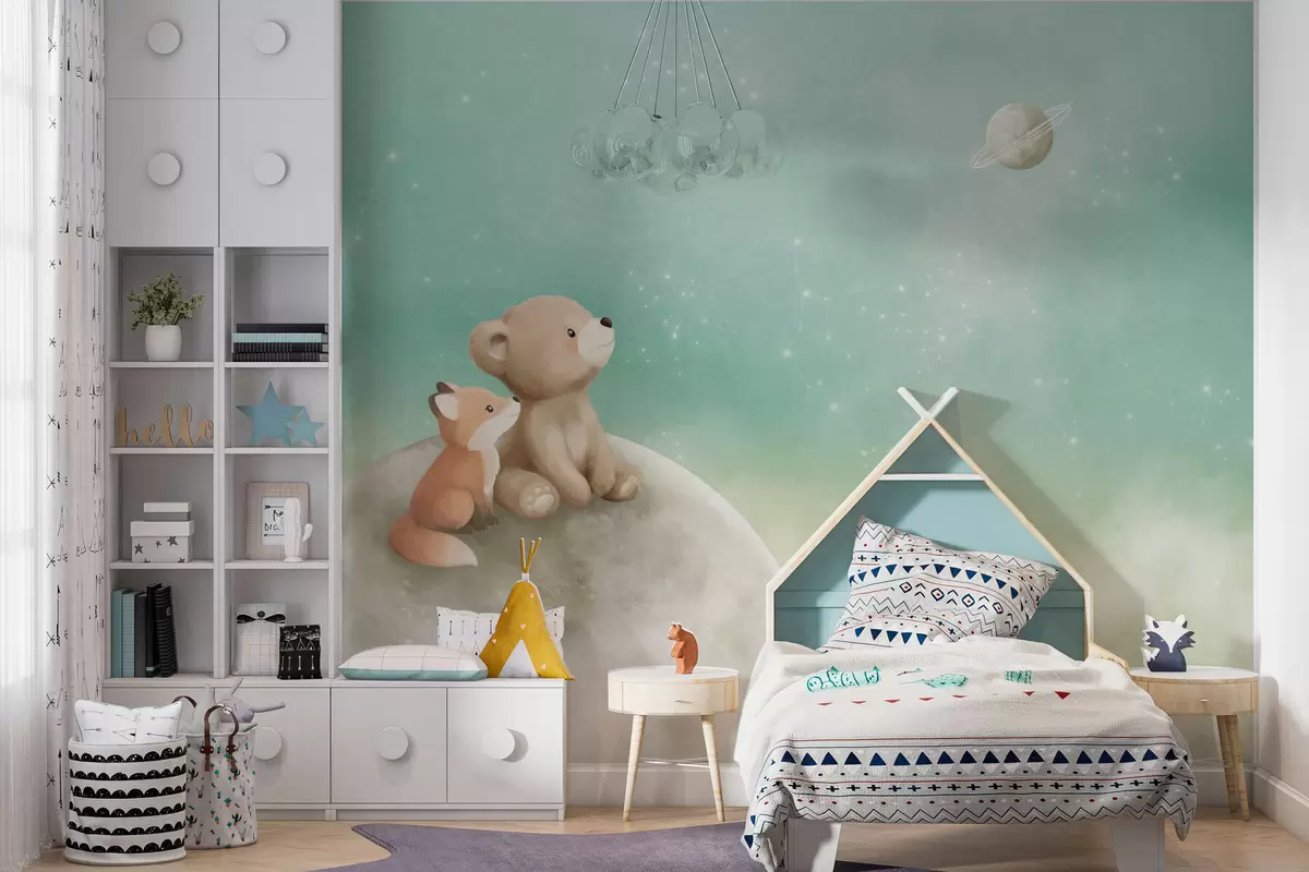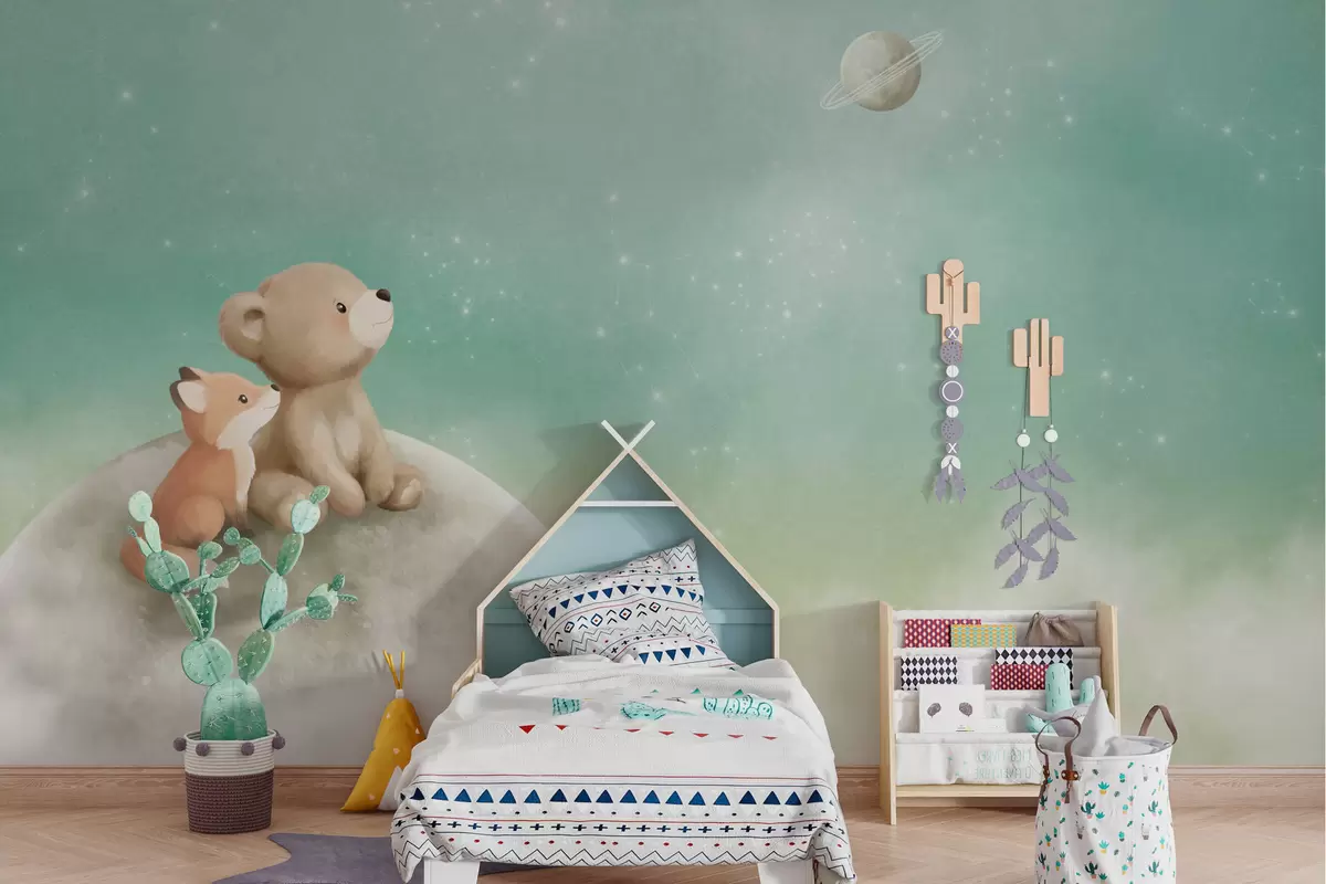 Fototapeedid Pastelljoonistus: karu ja rebane rohelise taeva taustal Nr w05431v1