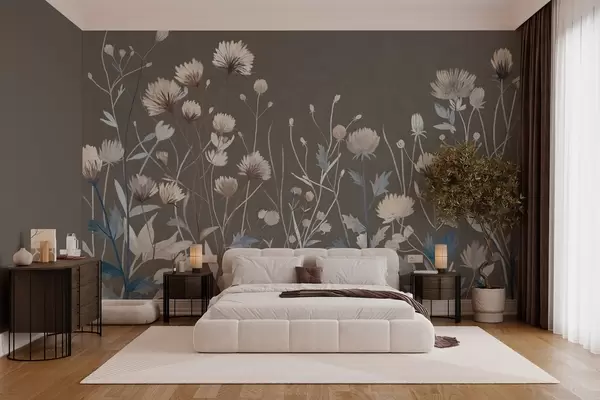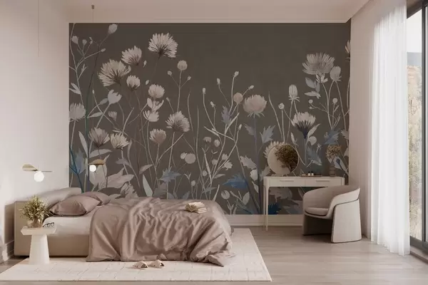 Fototapeedid Looduslikud põllurohud ja lilled, maalilises stiilis kujutatud hallikaspruuni taustal Nr w05563v2