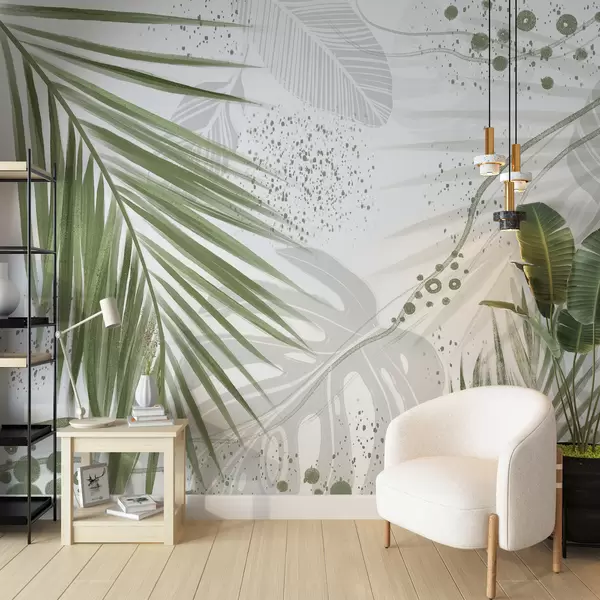 Fototapeedid Troopilised rohelised palmilehed ja -lehed, millel on abstraktsed kujundid ja pritsmed rohelistes ja valgetes toonides Nr w07918