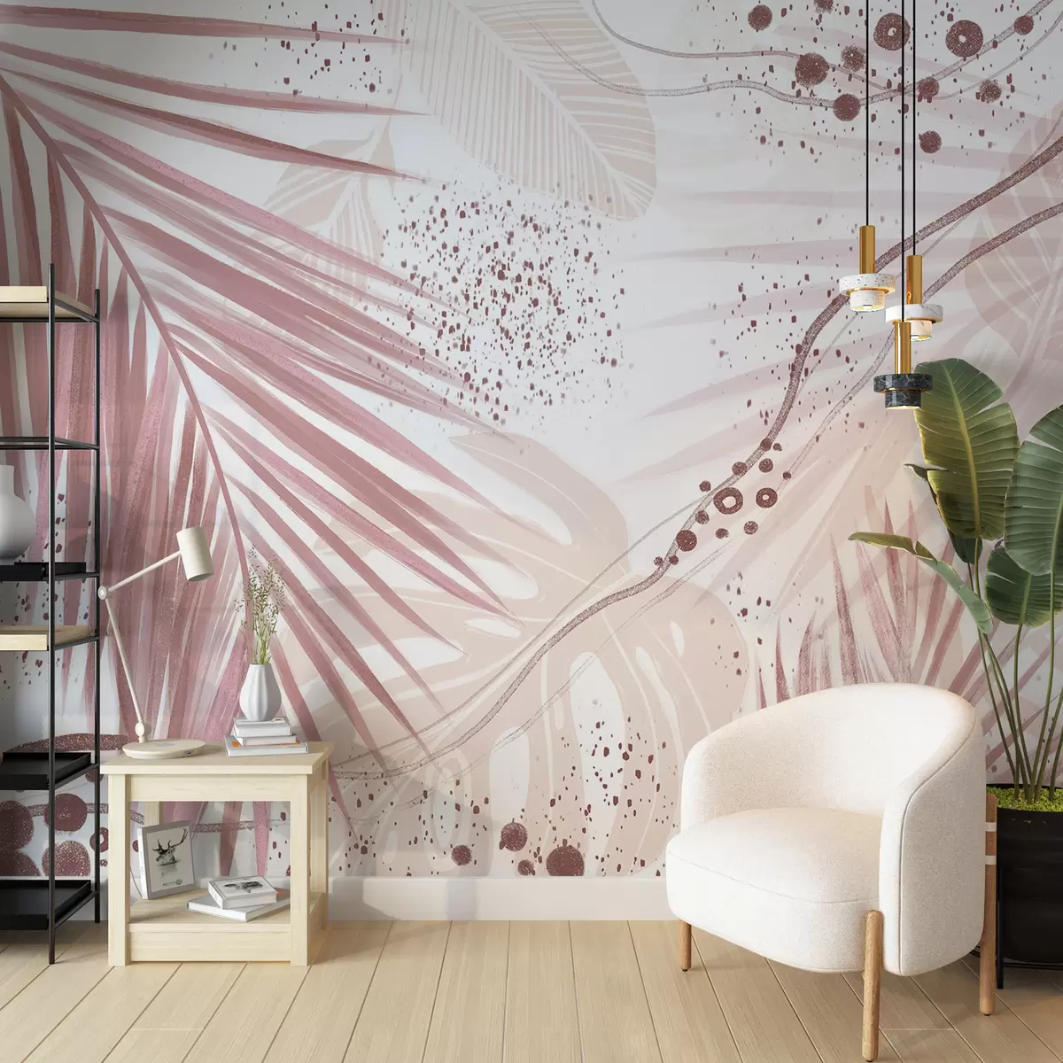 Fototapeedid Troopilised roosad palmilehed ja -lehed, abstraktsete kujundite ja roosade ja valgete varjunditega pritsmed Nr w07918v1